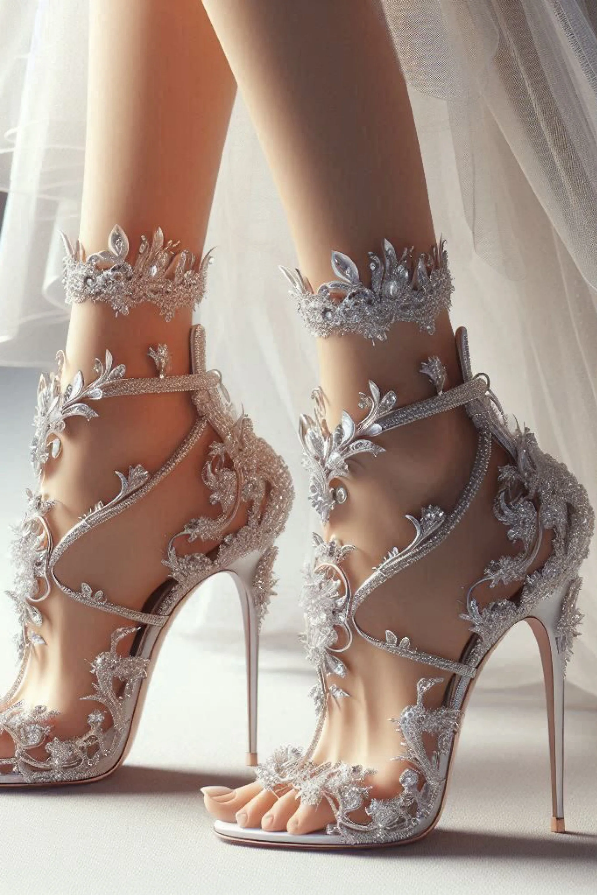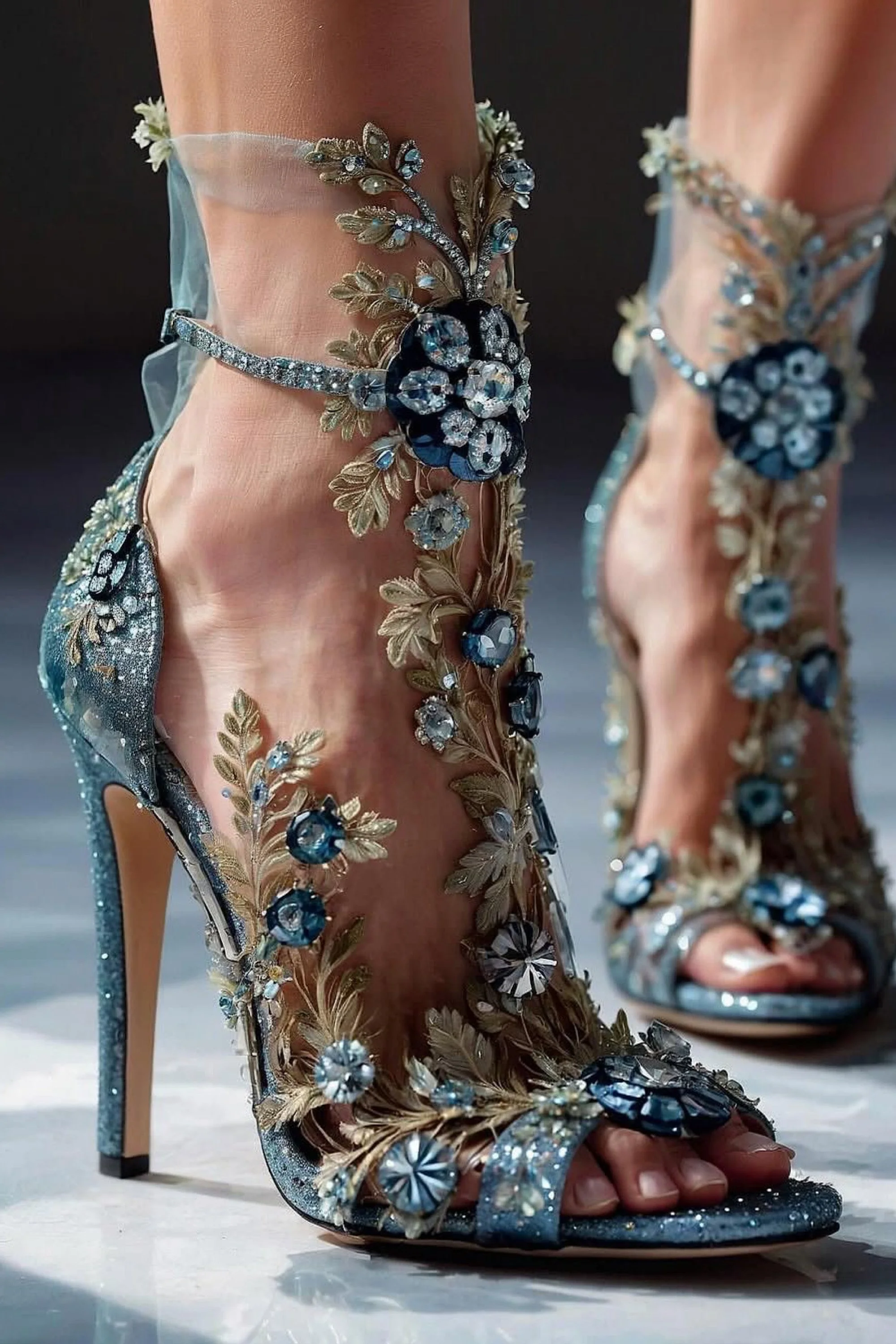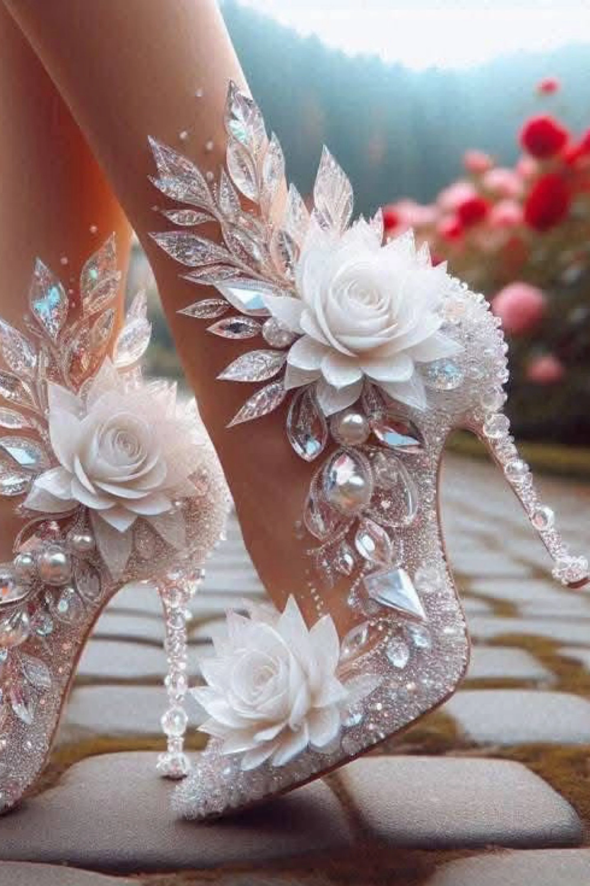 They were something out of legend. Slender, transparent heels that caught and refracted the light into shimmering rainbows with every movement. Fine crystal-cut leaves curled delicately over her toes, climbing her ankles in an intricate vine of frost and flame. Each jeweled petal blazed with iridescence—flashes of sapphire, rose, and ice. The open toe design revealed perfectly painted nails in a soft blush that seemed to glow against the gleaming facets.