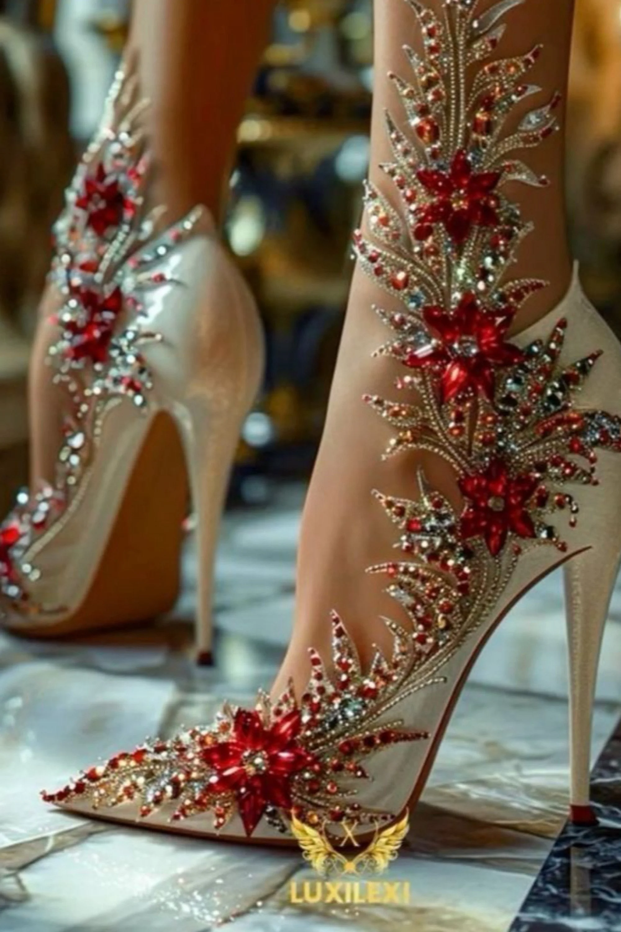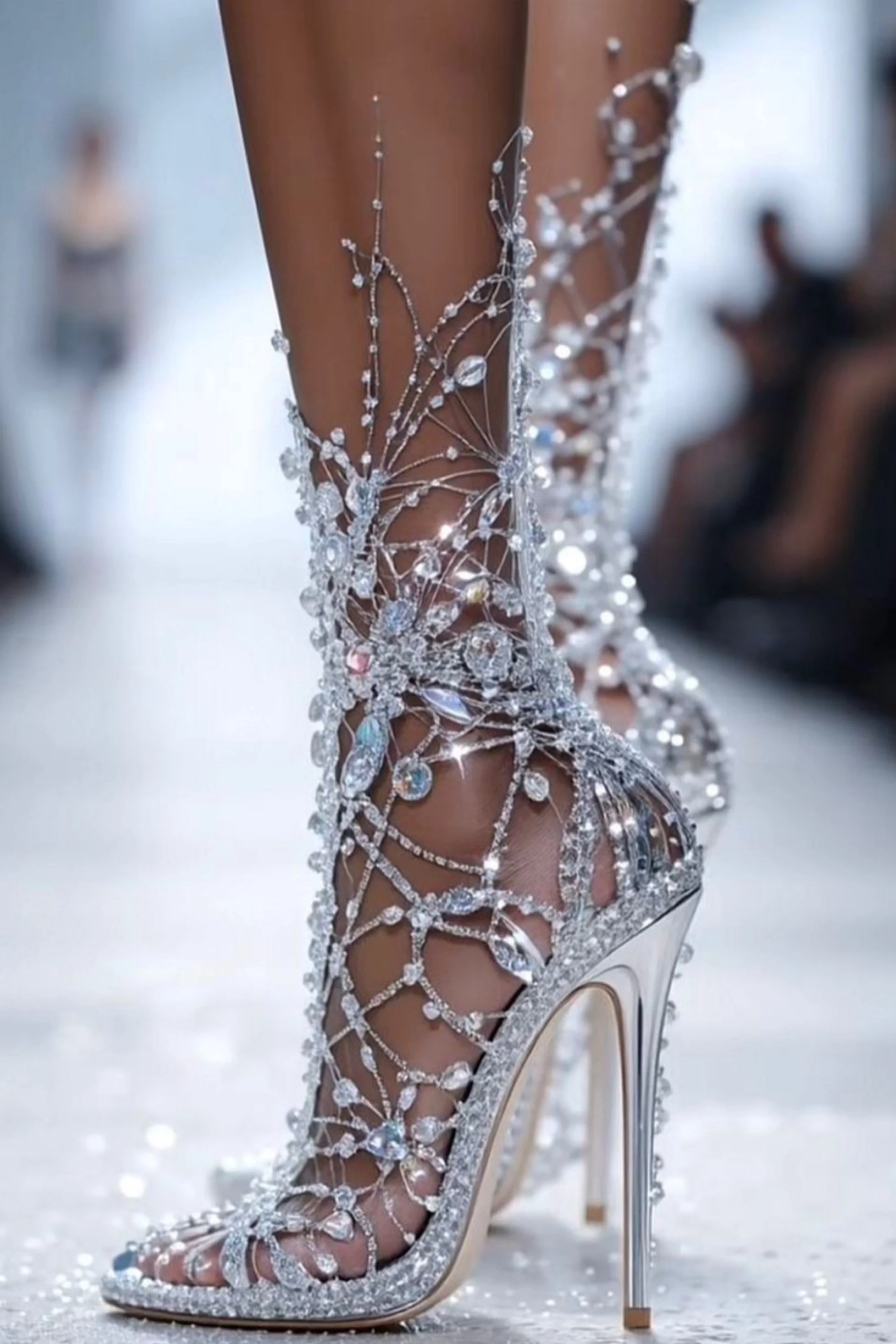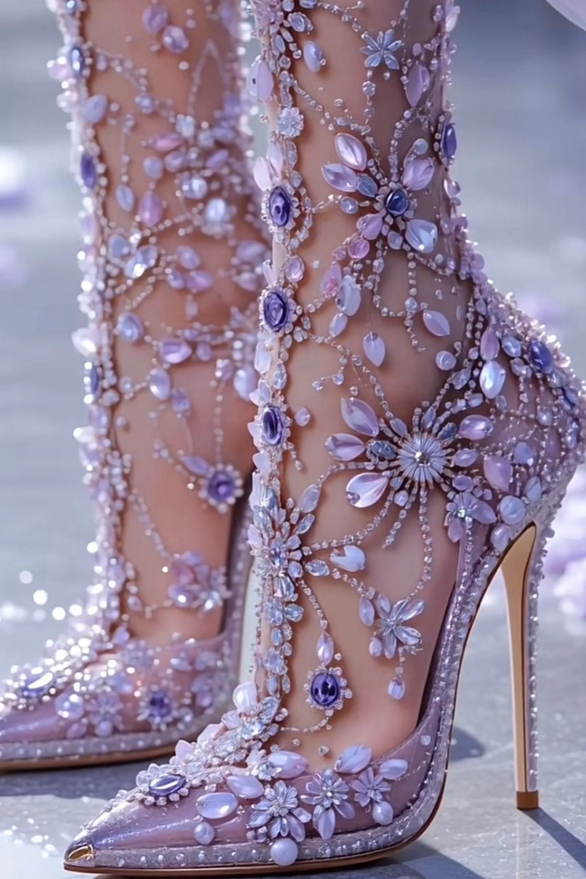 They were something out of legend. Slender, transparent heels that caught and refracted the light into shimmering rainbows with every movement. Fine crystal-cut leaves curled delicately over her toes, climbing her ankles in an intricate vine of frost and flame. Each jeweled petal blazed with iridescence—flashes of sapphire, rose, and ice. The open toe design revealed perfectly painted nails in a soft blush that seemed to glow against the gleaming facets.
