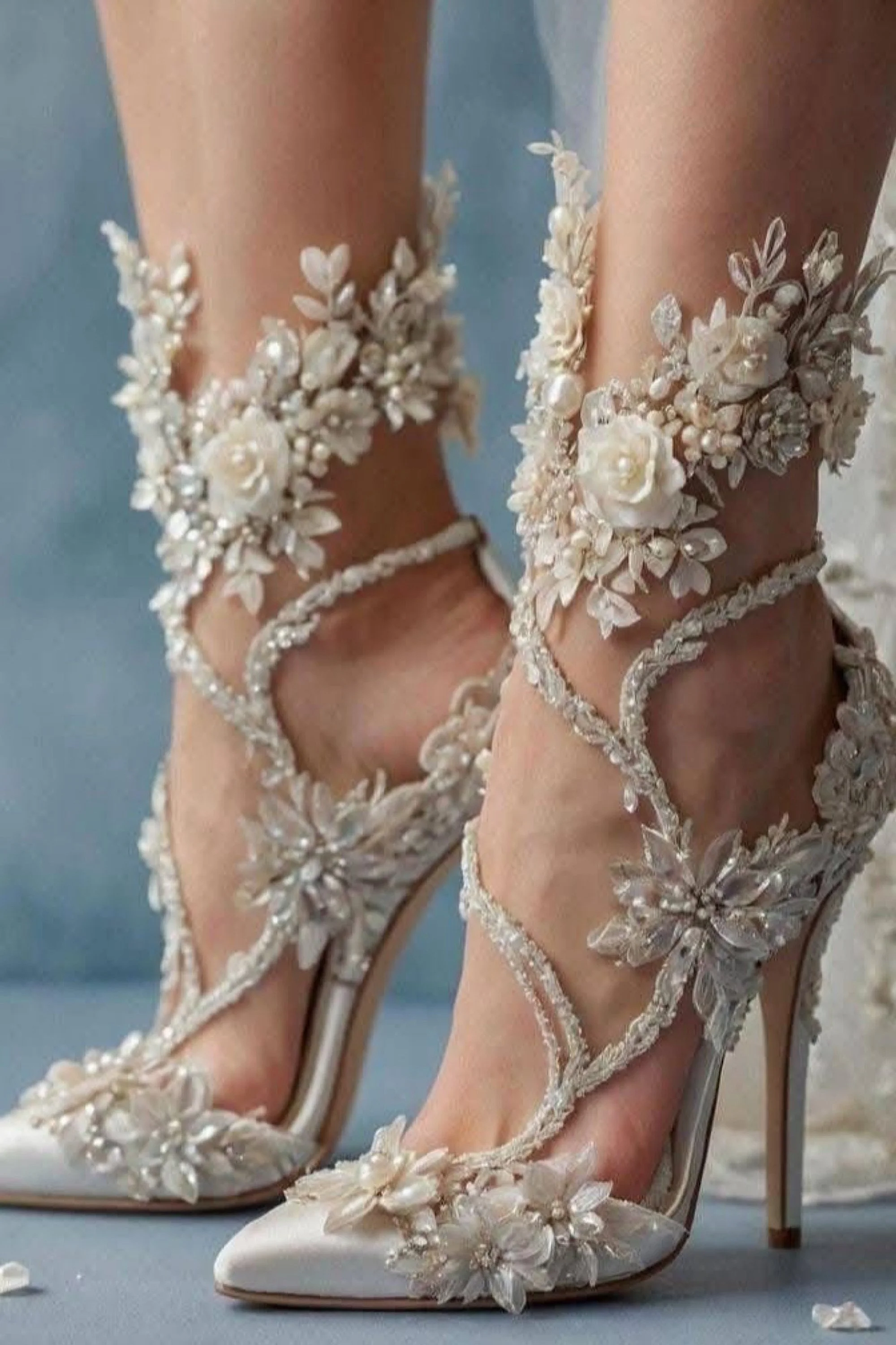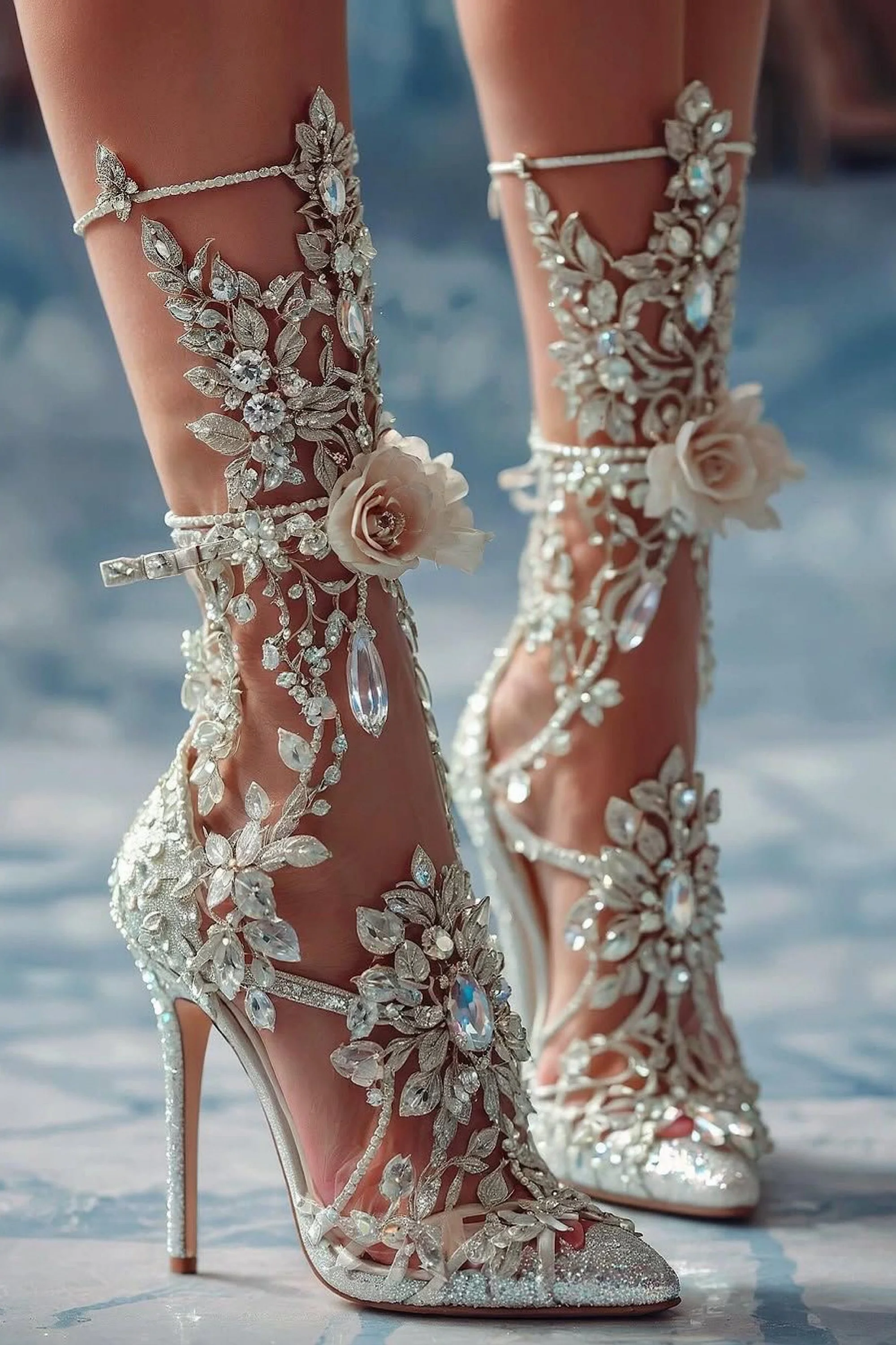 They were unlike anything else. A vision of crystalline frost and pure blossom, the stiletto heels were encrusted with glittering gems that caught the light like shards of winter ice. From the arch to the ankle, sculpted leaves unfurled upward, each veined in silver and studded with clear jewels that looked like frozen raindrops. And there, centered like a secret heart, bloomed a white rose—perfect, unyielding, eternal. It wasn’t silk, though it appeared soft; it was a masterpiece of layered fabric and diamond-cut shimmer, a flower that could not wilt.