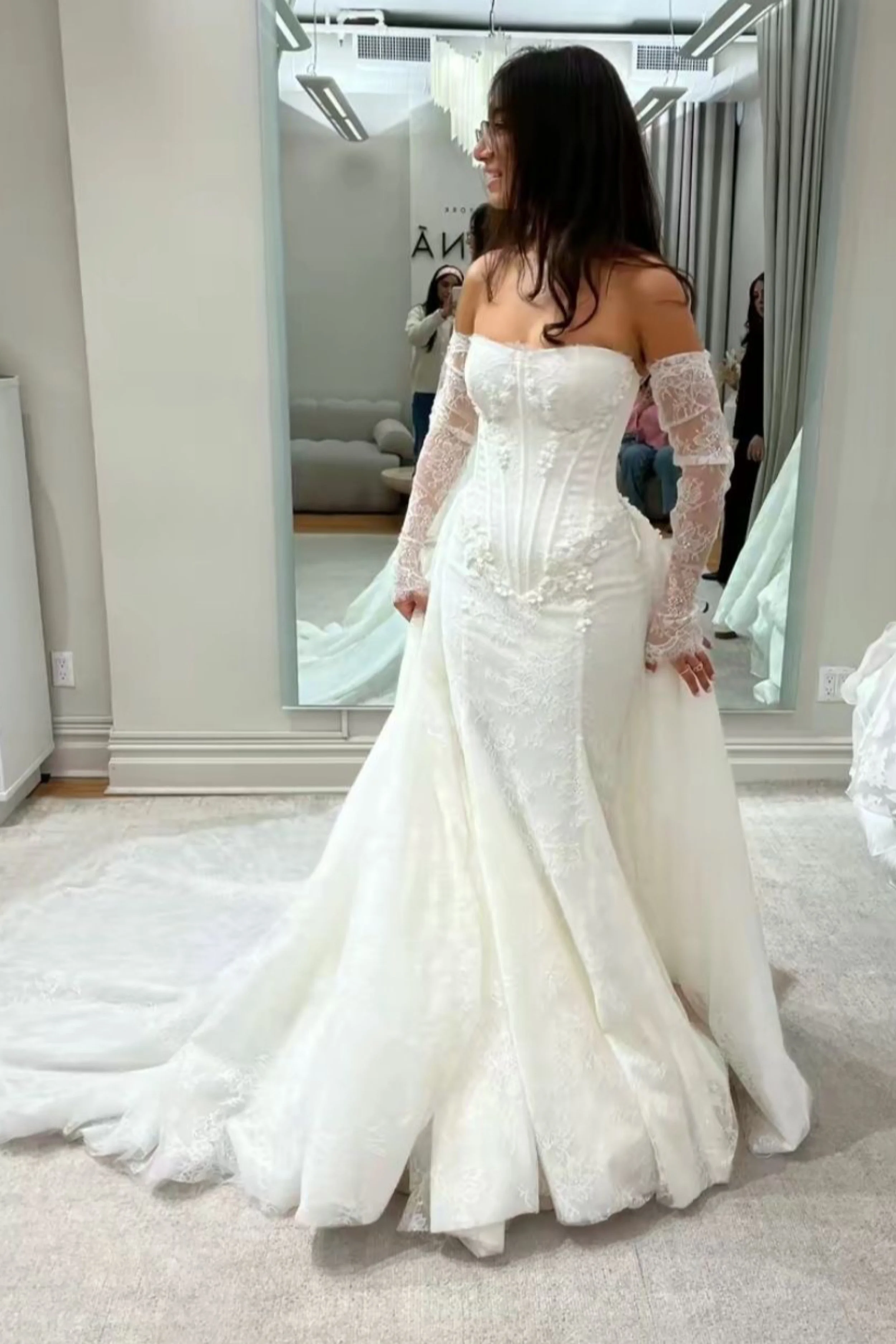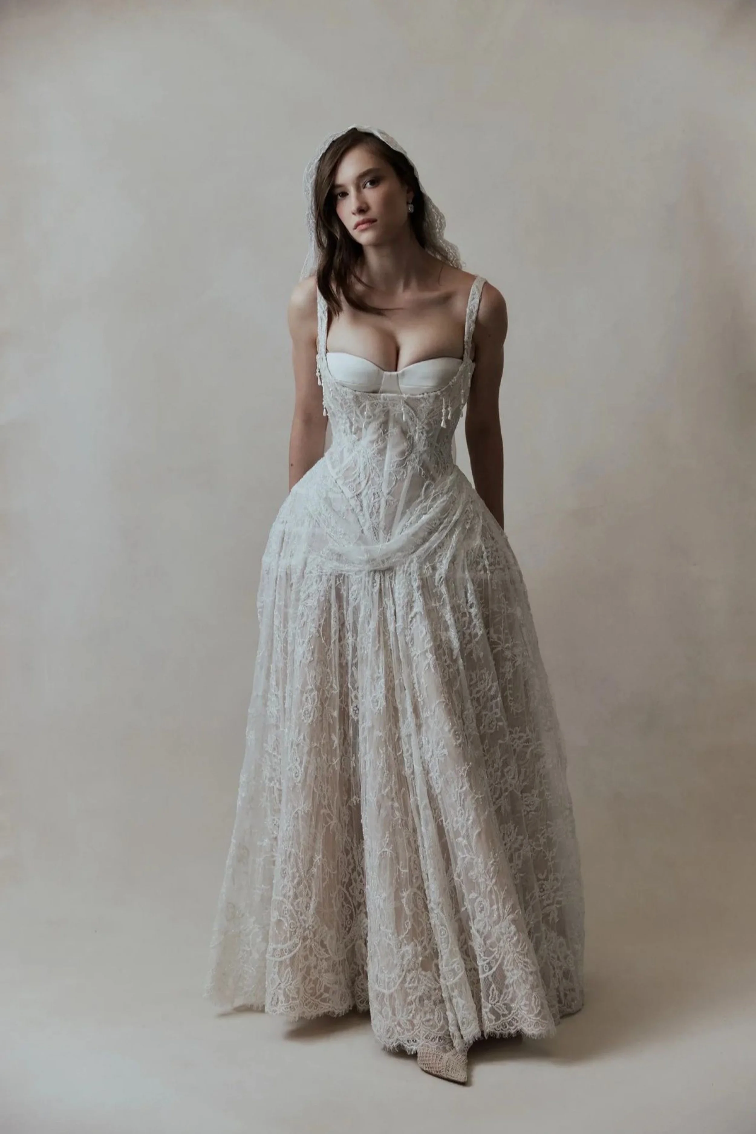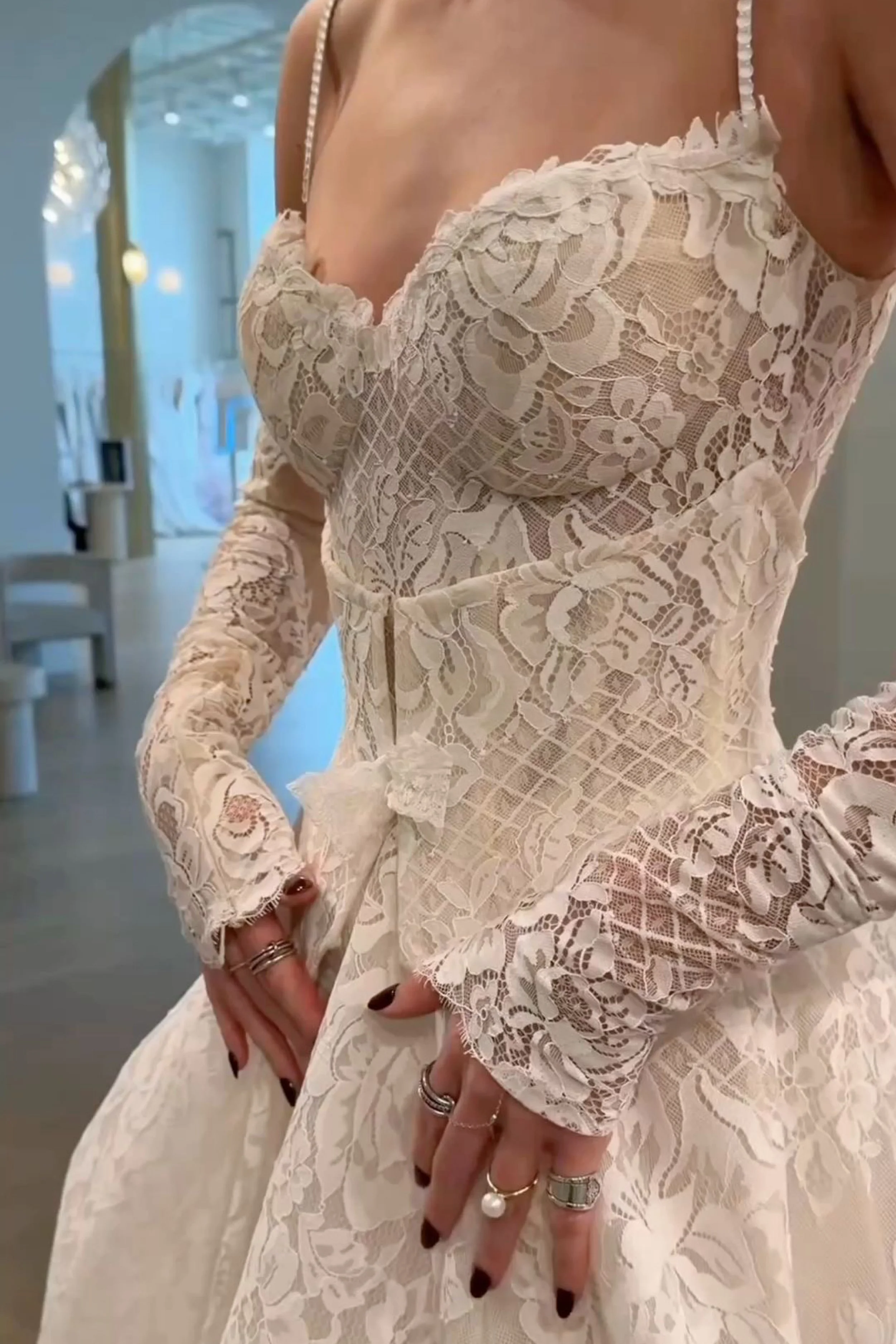 This gown is pure candlelight romance, built around a sculpted corset bodice wrapped in floral lace that feels both heirloom and daring. The neckline sits softly across the chest with a gentle sweetheart curve, while the sheer lace overlay reveals the boning lines in the most intentional way, like couture architecture under a veil of petals. Delicate pearl strap detailing adds a whisper of jewelry at the shoulders, balancing the structured waist with something light and luminous. The lace continues into fitted sleeves with an elongated cuff effect that reads editorial and old world at once. From the waist, the skirt falls in a calm, airy sweep, letting the lace pattern stay the star without competing with heavy sparkle. It is the kind of dress that photographs beautifully up close, where every thread and scallop edge becomes its own little story, and also holds its shape from a distance with a clean, romantic silhouette.