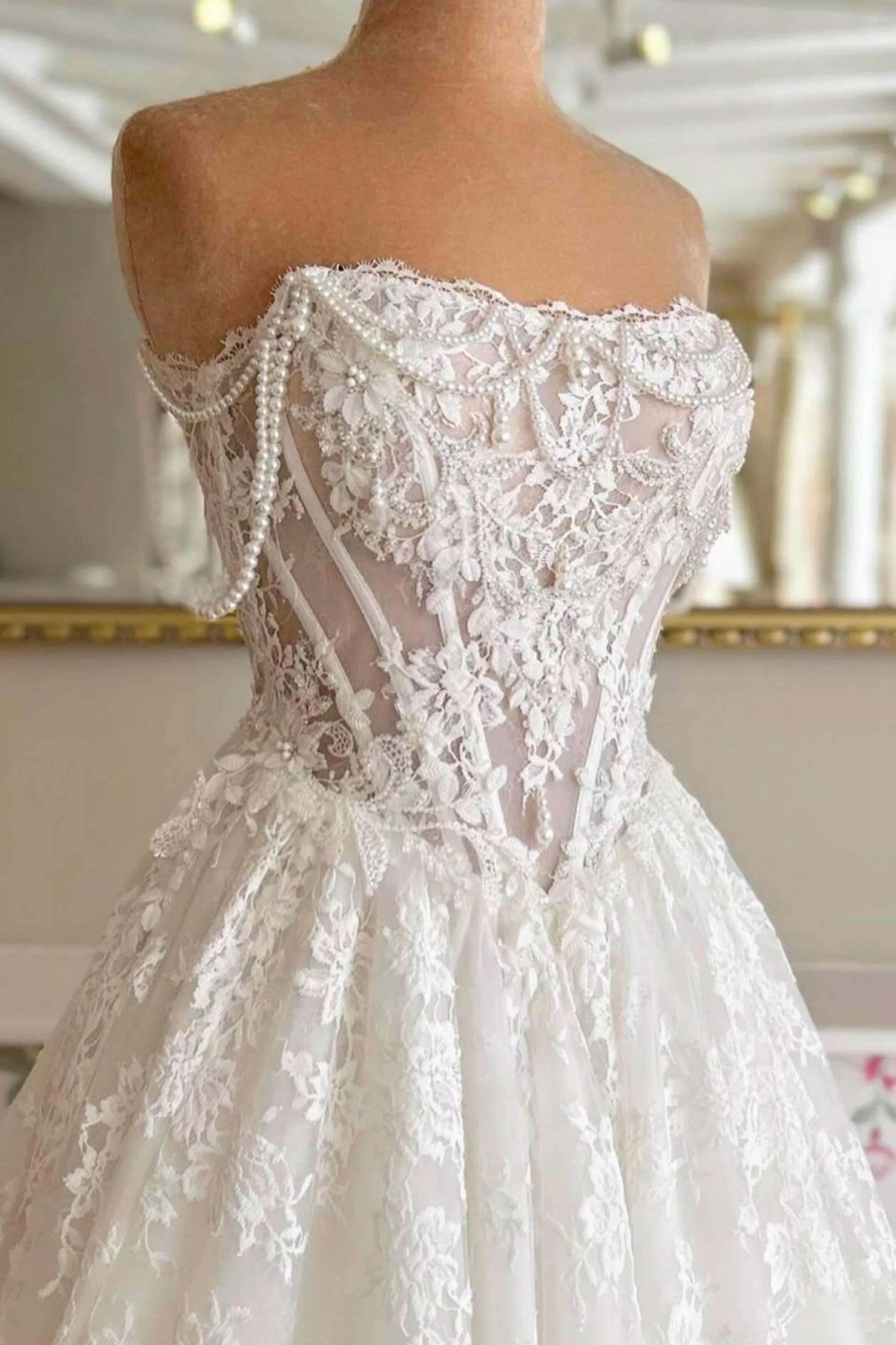This gown is a study in couture detail, especially from the back, where the corset structure becomes a design feature instead of something hidden. The bodice is sheer in the most elegant way, with floral lace appliqué placed over visible boning lines that sculpt the waist and lift the silhouette. An off shoulder neckline is trimmed with lace, then finished with draped pearls that fall like jewelry across the upper arm, giving the dress a vintage, aristocratic mood. The lace continues into the skirt with a soft, full sweep that feels airy and dimensional, creating a romantic balance to the structured bodice. It is the kind of gown that rewards every angle, because the front reads timeless bridal, while the back delivers the wow moment, especially in photos taken while walking away, turning, or standing beneath warm venue lighting. The overall look is refined, luxurious, and quietly dramatic, with texture doing all the work instead of heavy sparkle.
