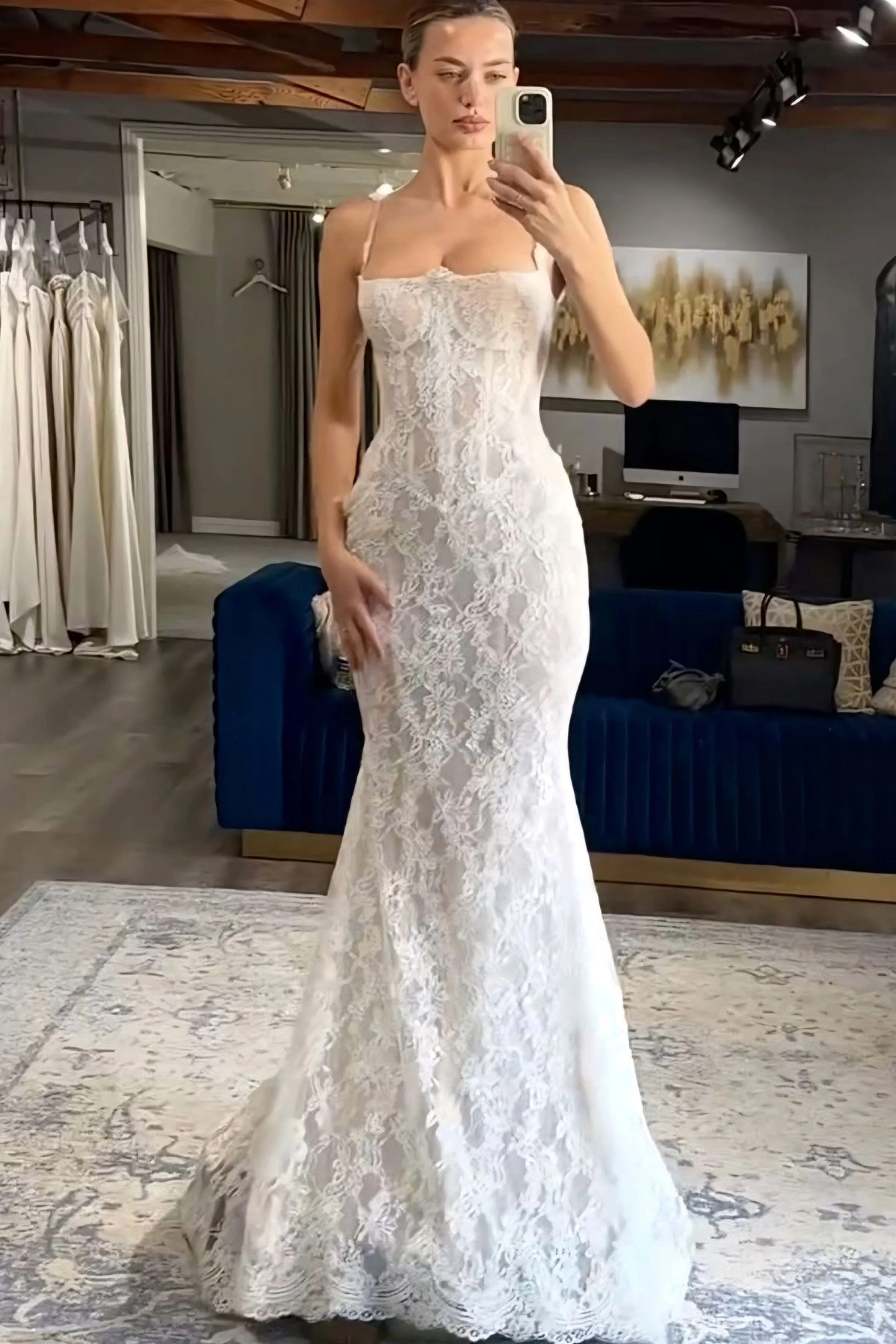 This gown is a refined take on lace, designed for brides who want sleek lines with just enough romance. The silhouette is a fitted column that skims the body, with an elegant square neckline and slim straps that feel modern and clean. Lace appliqué climbs across the bodice and down the skirt in a continuous pattern that elongates the figure, while the overall finish stays crisp and streamlined rather than heavily embellished. It is the kind of dress that looks effortless in a boutique mirror selfie and even better in natural light, because the texture shows without needing sparkle. The train is subtle and graceful, adding a soft bridal sweep behind you without overwhelming the minimalist shape. This is a perfect choice for a city ceremony, a coastal venue, or any wedding where you want sophistication first, with lace as a quiet, intimate detail. It feels contemporary, timeless, and very easy to style without overthinking.