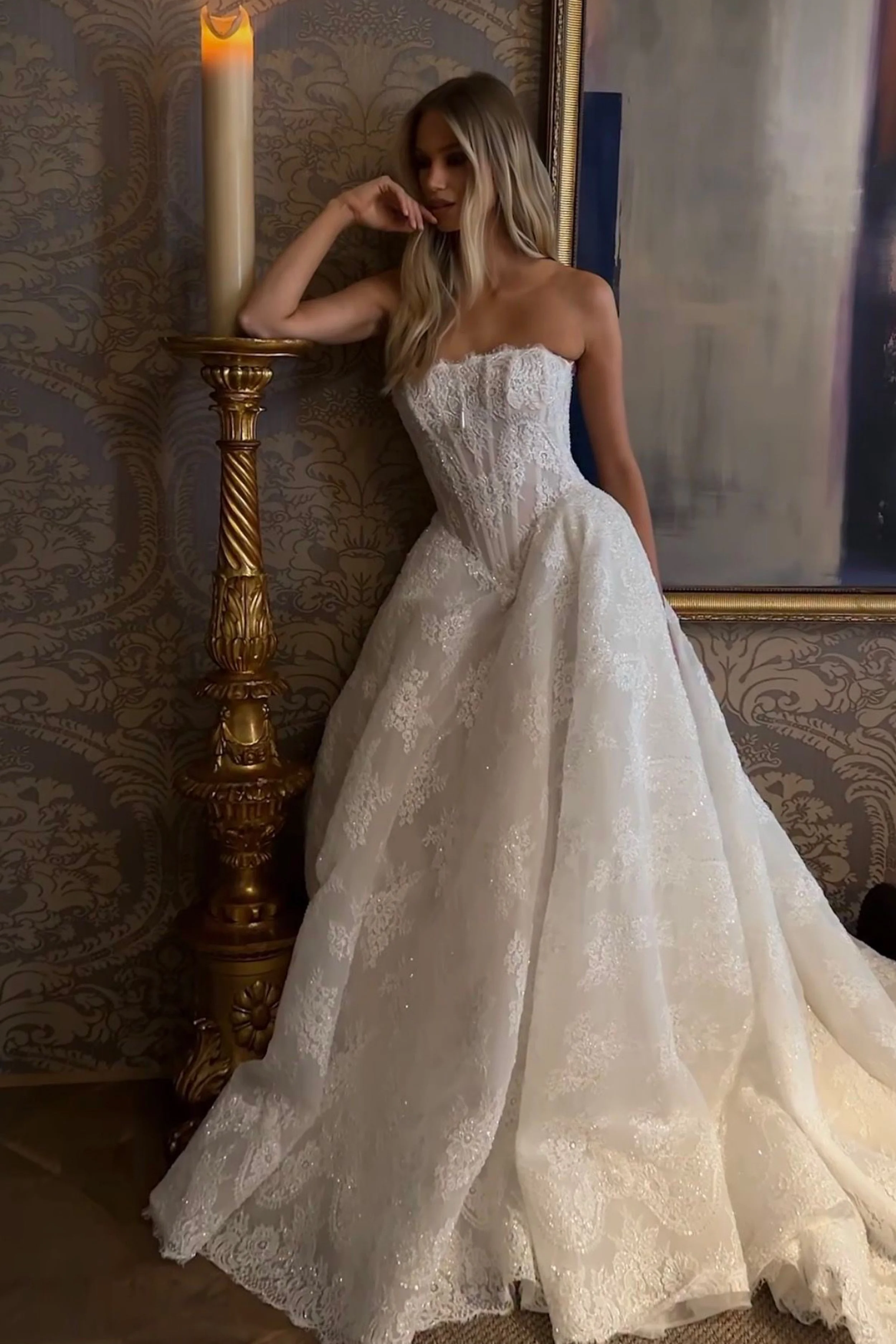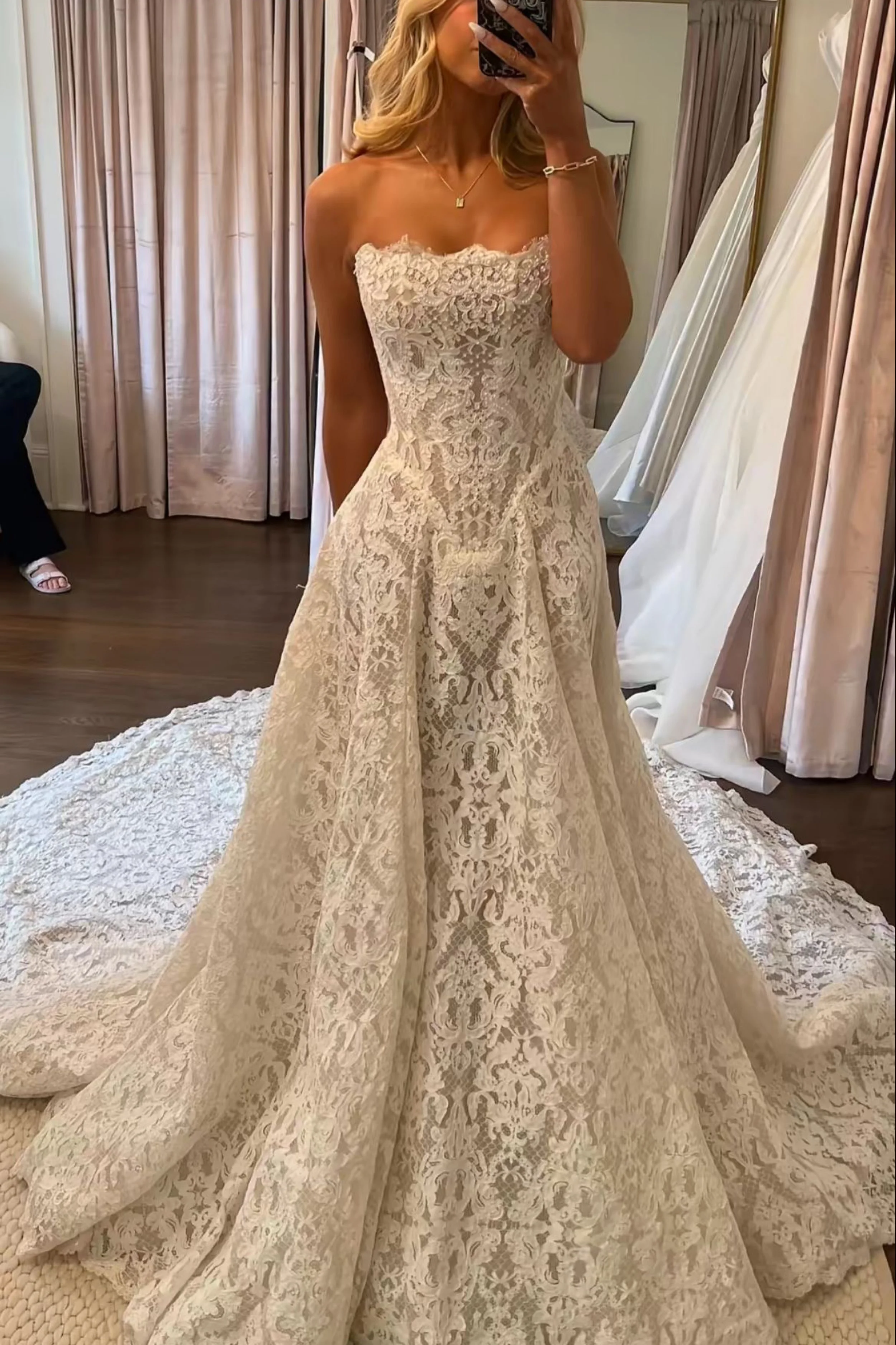 This gown is classic bridal romance with a couture fit, built around a strapless lace bodice that hugs the torso and flares into a full, sweeping skirt. The neckline is softly structured, giving a clean frame that highlights the collarbone, while the lace pattern is rich and ornate, with larger motifs that read beautifully from a distance. The skirt opens into a generous silhouette with a long train that pools behind like a vintage love story, making every step feel ceremonial. The lace appears layered over a warmer base, giving depth and contrast so the pattern looks dimensional instead of flat. It is a dress that photographs like a dream in both bright daylight and indoor lighting, because the texture remains visible and the silhouette stays strong. This is a statement gown without needing heavy sparkle, relying on scale, structure, and that unforgettable train to create the moment.