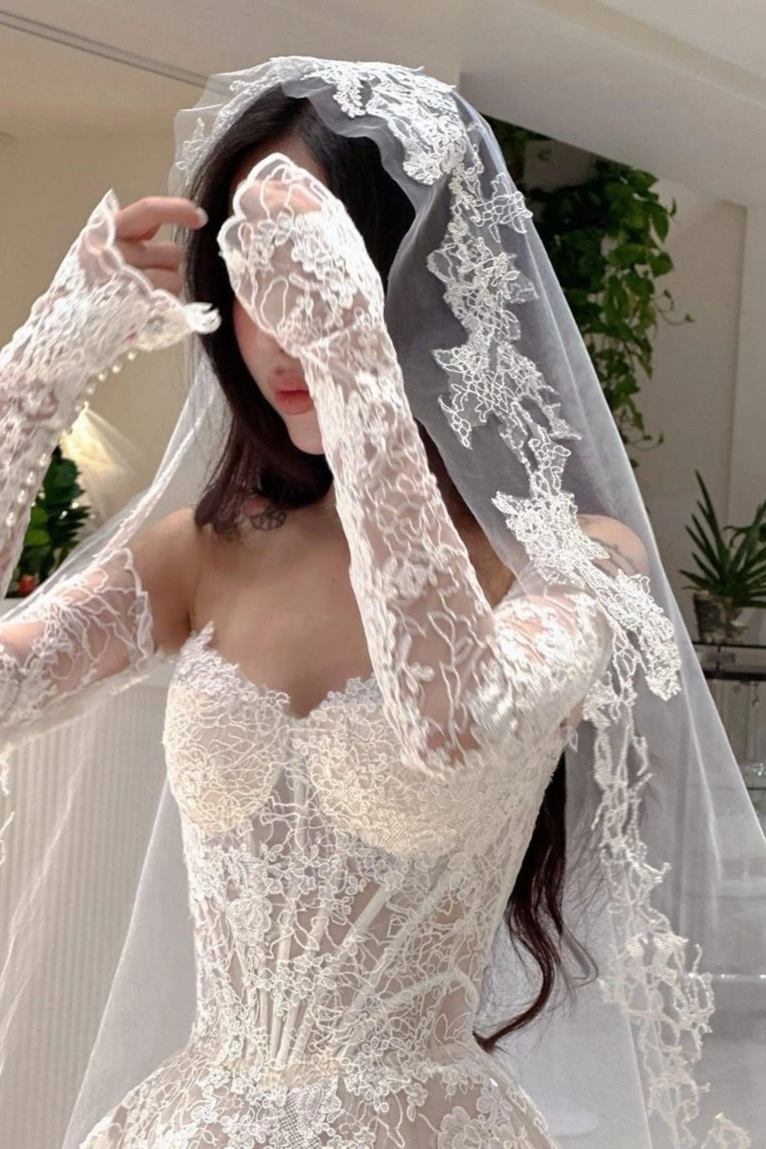 This look is bridal drama done with softness, built around a lace corset bodice that feels sculpted and delicate at the same time. The neckline is gentle and romantic, with lace tracing the edge like a hand drawn flourish, while the bodice structure gives a defined waist and a couture fit through the torso. What makes this styling unforgettable is the pairing of sheer lace gloves with pearl accents and a veil edged in lace appliqué. The veil frames the face like a halo, and the lace motifs cascade down in a way that feels almost botanical, like vines drifting through light. The overall effect is ethereal but also editorial, the kind of bridal moment that feels intimate and cinematic, especially in bright natural light. It is a perfect balance of softness and intention, with textures layered carefully so the lace never looks busy, just dimensional. Every detail invites a close look, from the glove embroidery to the veil edge, creating a bridal portrait that feels like it belongs in a fashion story.