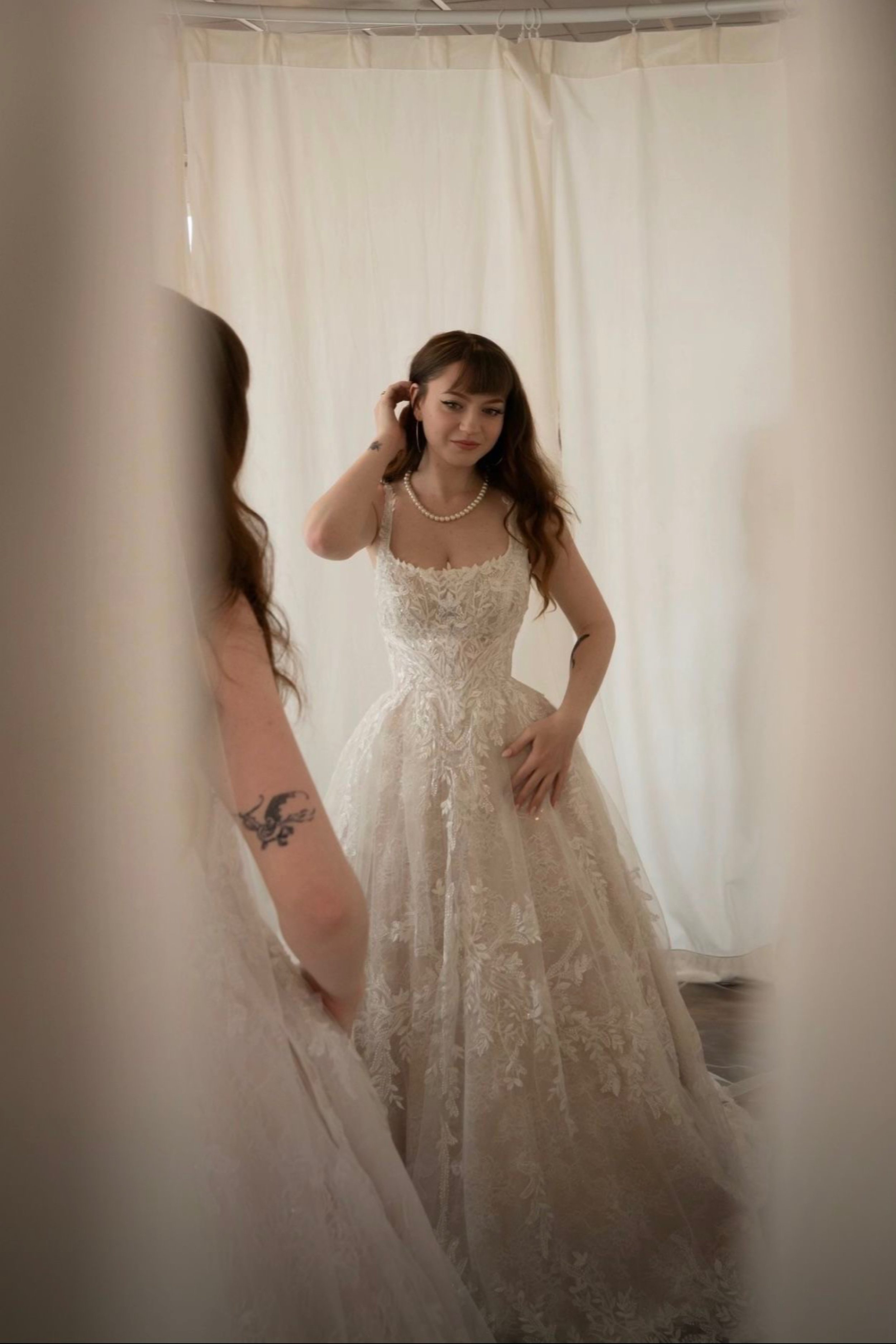 There is a certain kind of wedding dress that does not just look beautiful. It changes the temperature of the room. It makes the mirror feel like a movie screen, turns ordinary light into something flattering, and gives you that rare, immediate certainty that you are wearing the moment you have been imagining.