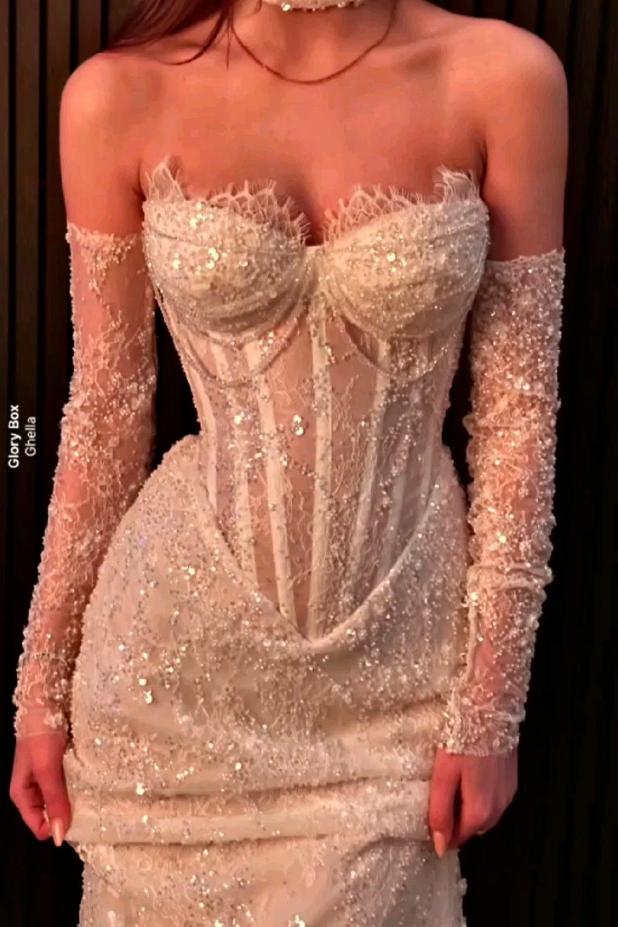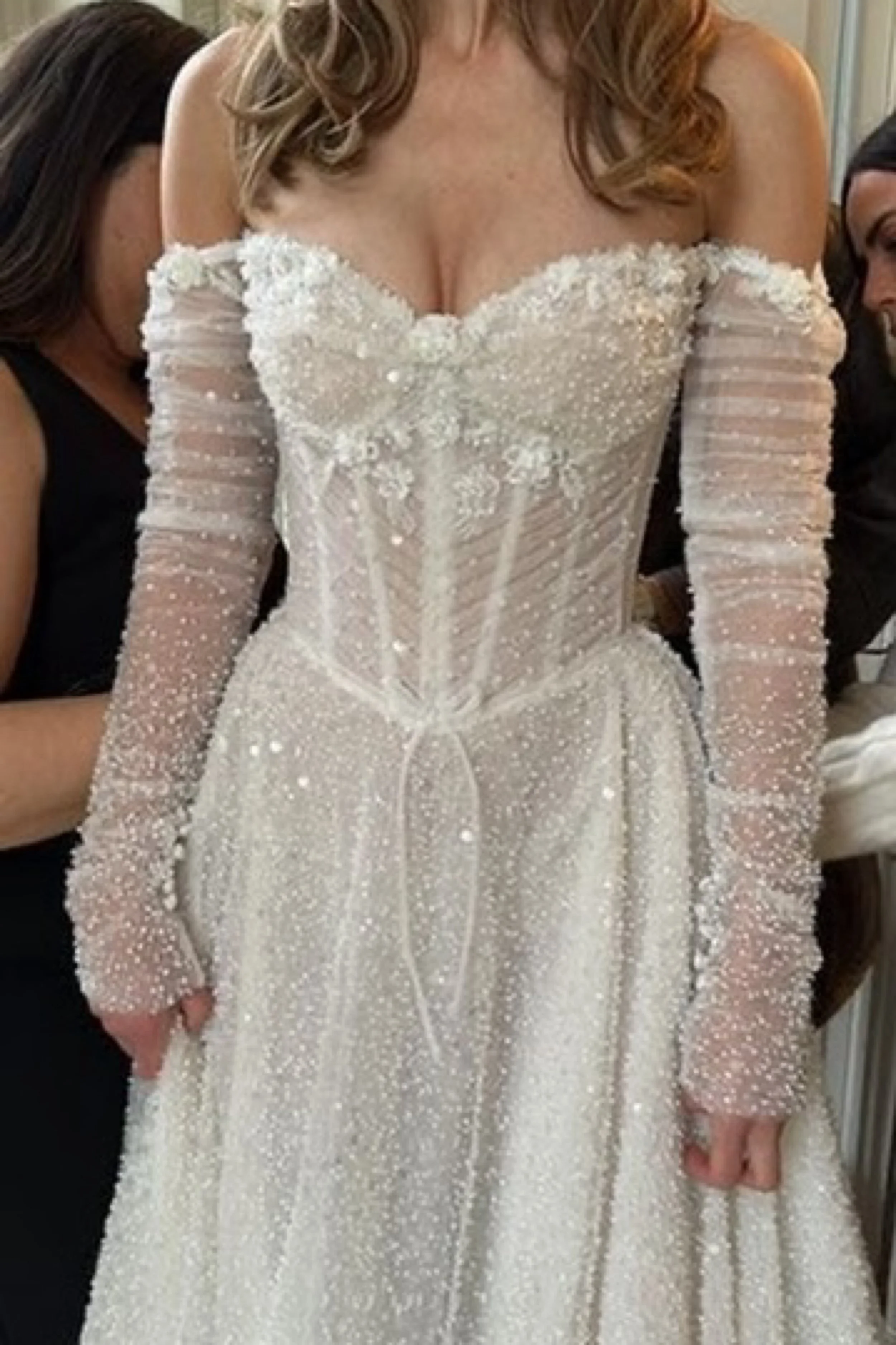 This dress is a shimmering fairytale with a couture edge, designed to sparkle in motion and glow under warm reception lighting. The bodice is structured and corseted, covered in tiny pearl like beading that creates a soft, luminous texture across the entire gown. The neckline sits off shoulder in a gentle sweetheart shape, while sheer sleeves and glove length cuffs add a dramatic, editorial finish. The bodice details feel sculptural, with defined seams that contour the waist and lift the silhouette, then the skirt opens into graceful volume that looks plush and romantic rather than stiff. The sparkle is refined, more pearl dust than glitter, which makes it feel expensive and timeless even with the high impact shine. This is a gown made for grand entrances, candlelit ballrooms, and photos where every inch of the fabric catches light like a constellation.