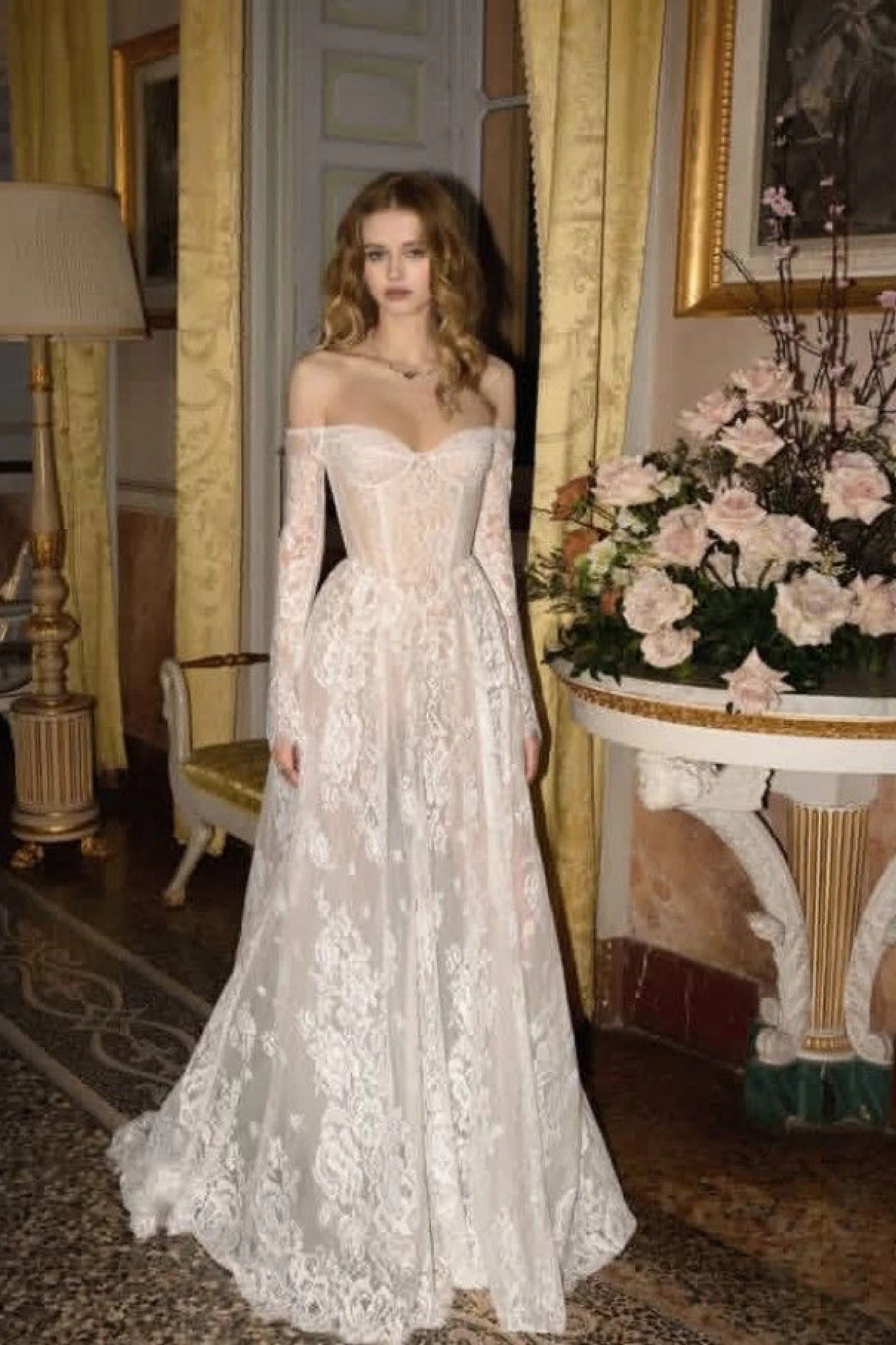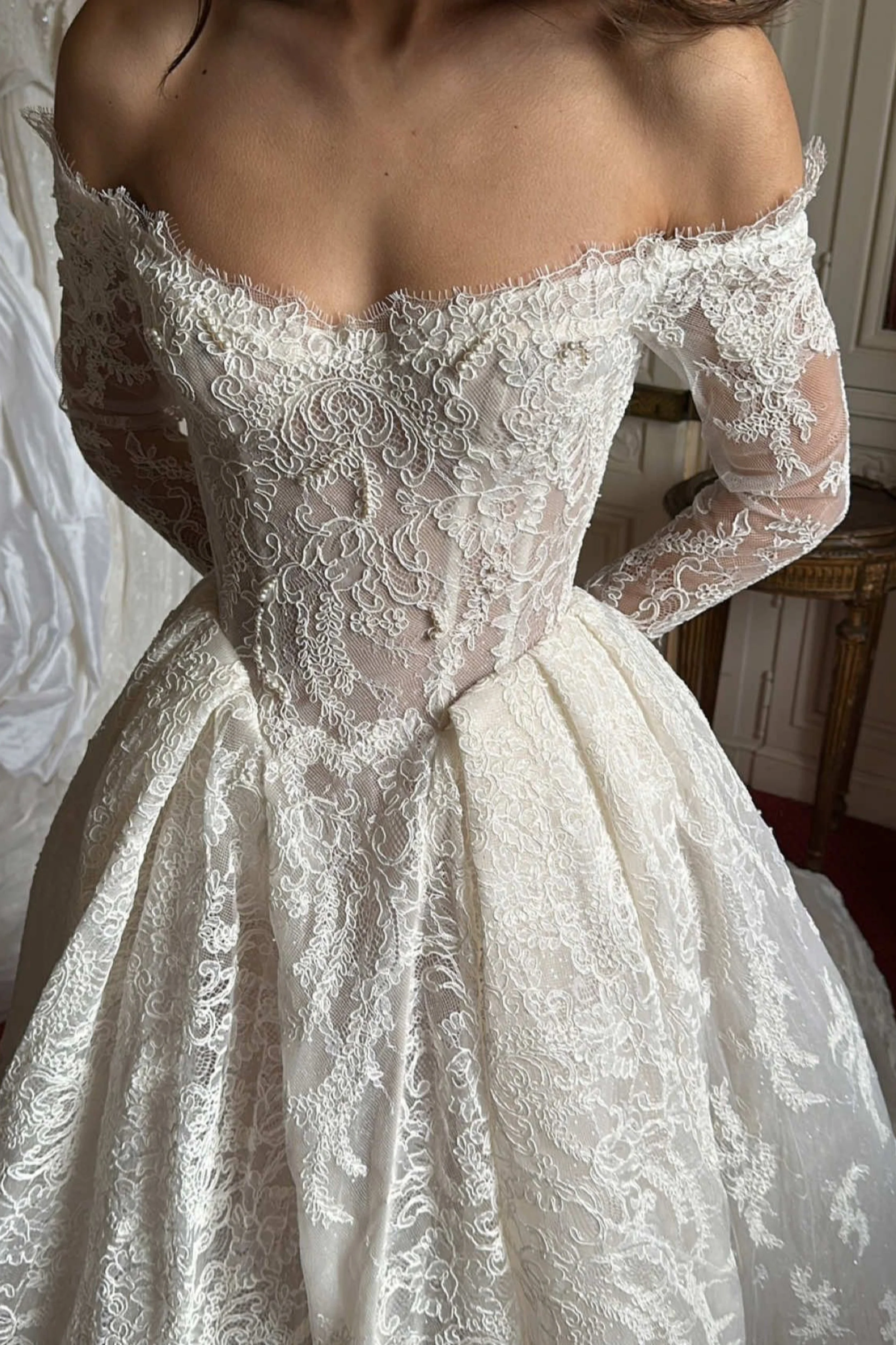 This gown reads like a modern fairytale written in lace, with a fitted bodice that shapes the waist and a full skirt that moves like a quiet cloud. The neckline is off shoulder and gently curved, giving the collarbone a frame that feels timeless and cinematic. The bodice is structured through the torso, with lace motifs placed to flatter and elongate, then the skirt opens into a sweeping, floor length silhouette that feels grand without looking heavy. The lace pattern is classic floral, but the overall styling feels fresh because the lines are clean and the fabric looks airy rather than densely embellished. It is the kind of dress that belongs in a candlelit foyer, framed by gilded details and soft florals, yet it would look just as striking in a modern venue because the shape is so confident. The long lace sleeves add elegance and balance, making the gown feel complete from every angle, like it was designed for portraits, slow walks, and one unforgettable entrance.
