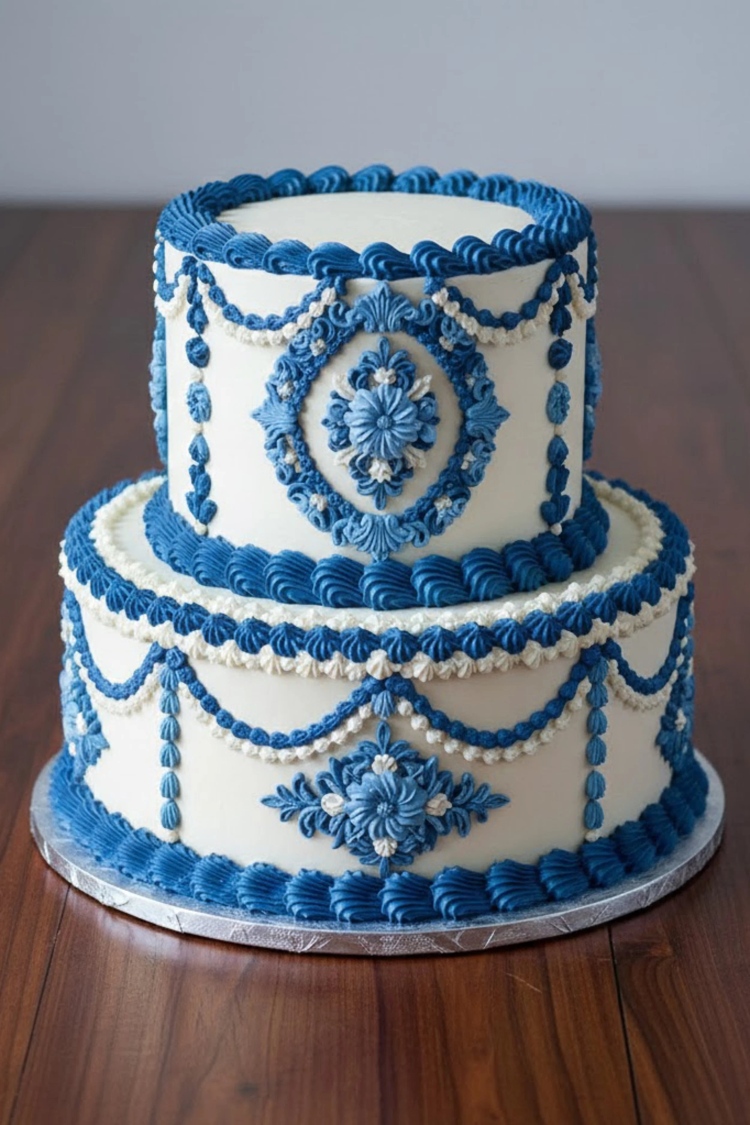 This cake is a two tier design with a tall top tier and a wide lower tier, both finished in smooth white buttercream. Deep cobalt piping creates bold Lambeth swags, bead strands, and ornate medallion florals that frame the tiers like vintage porcelain patterns.