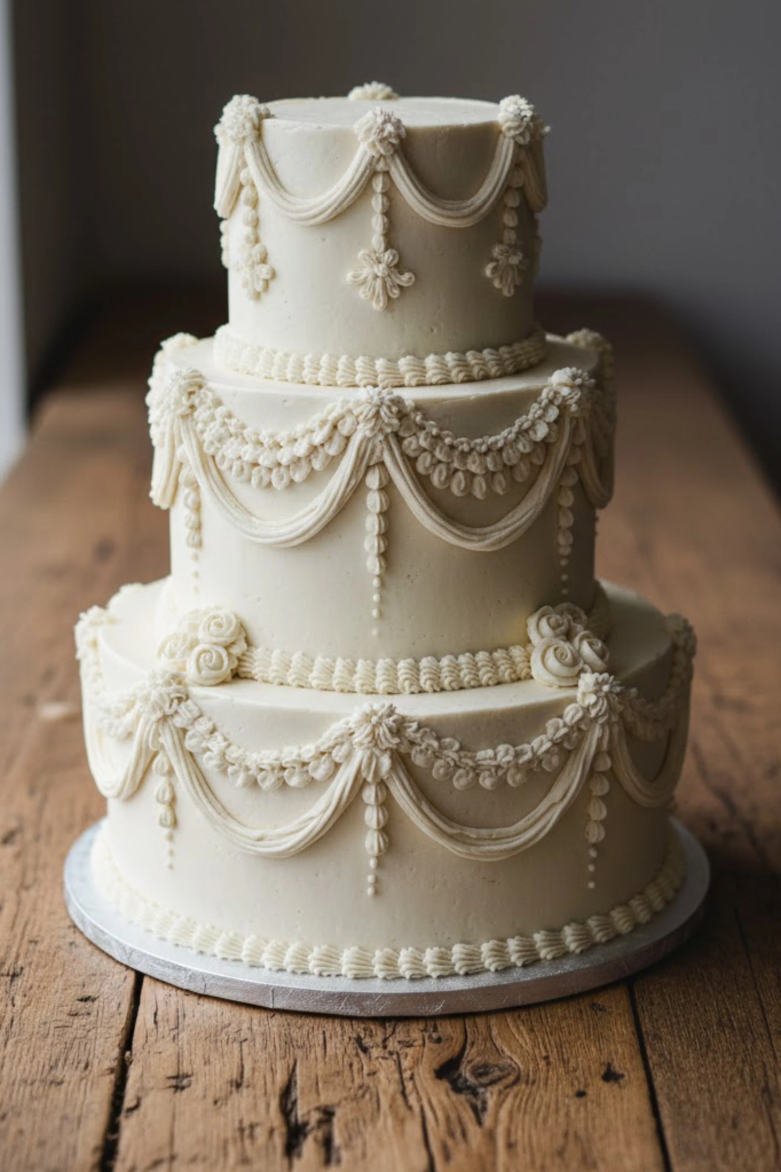 This cake is a three tier stacked design with a tall top tier and generous spacing between each tier ledge. The buttercream finish is smooth and creamy ivory, with ornate swag garlands that drape like fabric across every tier. Bead strands and tiny floral knots hang at the swag points, creating a jewelry like rhythm around the cake.