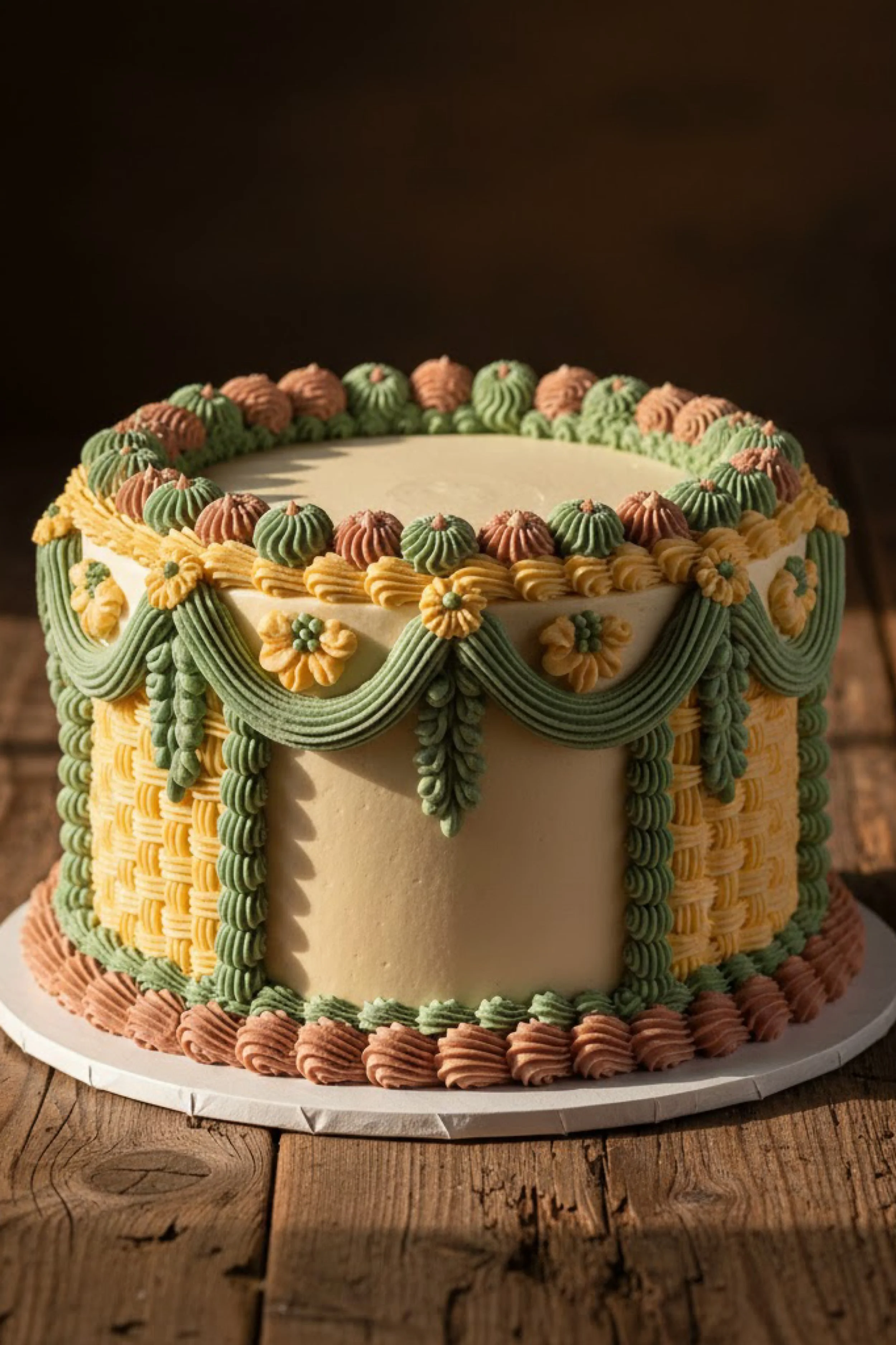 This single tier statement cake is tall and modern in shape, with smooth buttercream sides framed by a basketweave panel detail. The Lambeth piping comes in earthy greens, warm golds, and soft terracotta, with swags and petite floral accents around the top edge that give it a charming, seasonal feel.