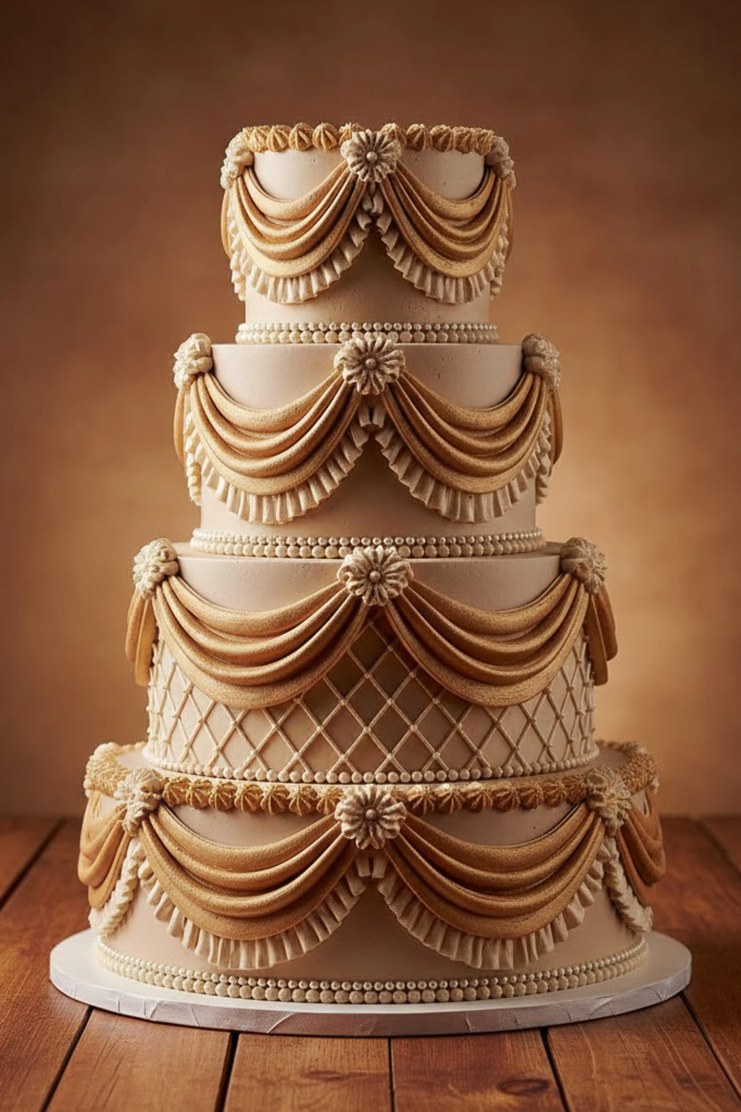 This cake is a four tier stacked design with a warm beige buttercream base and caramel toned Lambeth drapes that feel like gathered satin. The lower mid tier features a delicate lattice panel that adds texture and a couture structure, while bead borders and floral knots keep the design cohesive across tiers.
