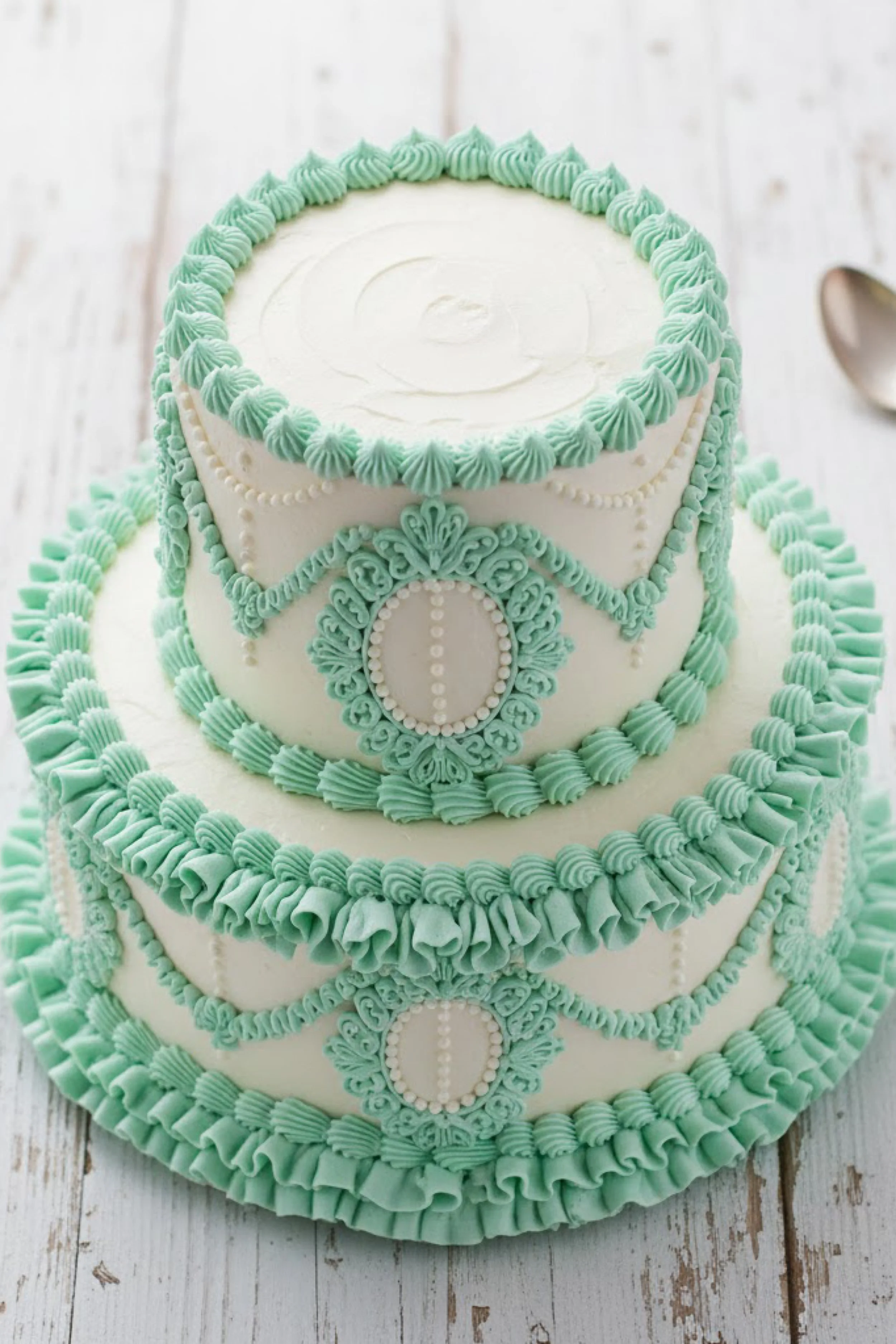 This cake is a two tier design with a smaller top tier centered on a wide bottom tier, both finished in smooth white buttercream. Mint green Lambeth piping frames cameo style medallions on each tier, with ruffled borders and scalloped swags that feel playful yet structured.