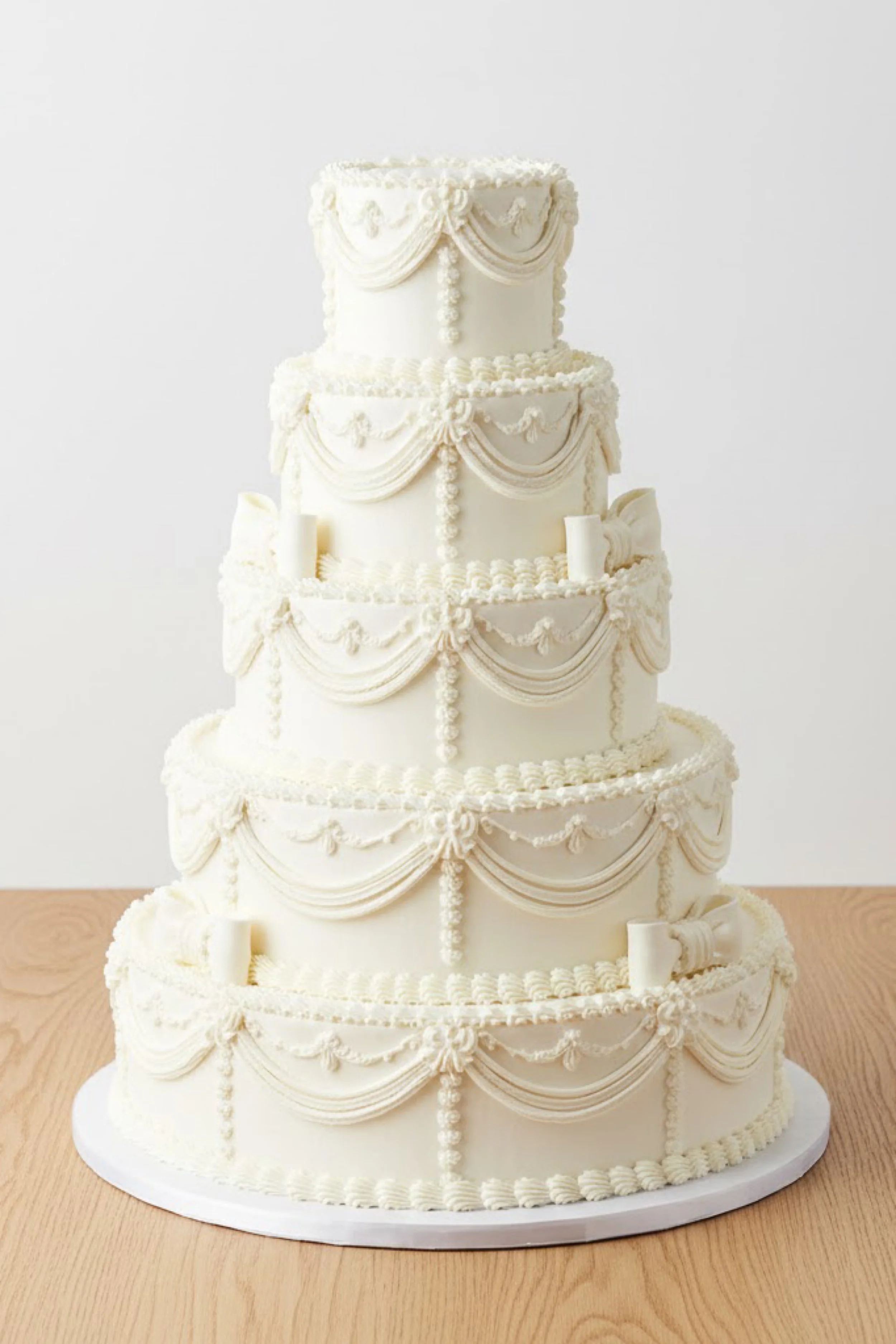 This cake is a tall five tier masterpiece in classic white buttercream, with repeated Lambeth swags and bead strands creating a cathedral like sense of scale. Each tier features layered drapes, scalloped borders, and delicate hanging details that build a consistent rhythm from top to bottom.