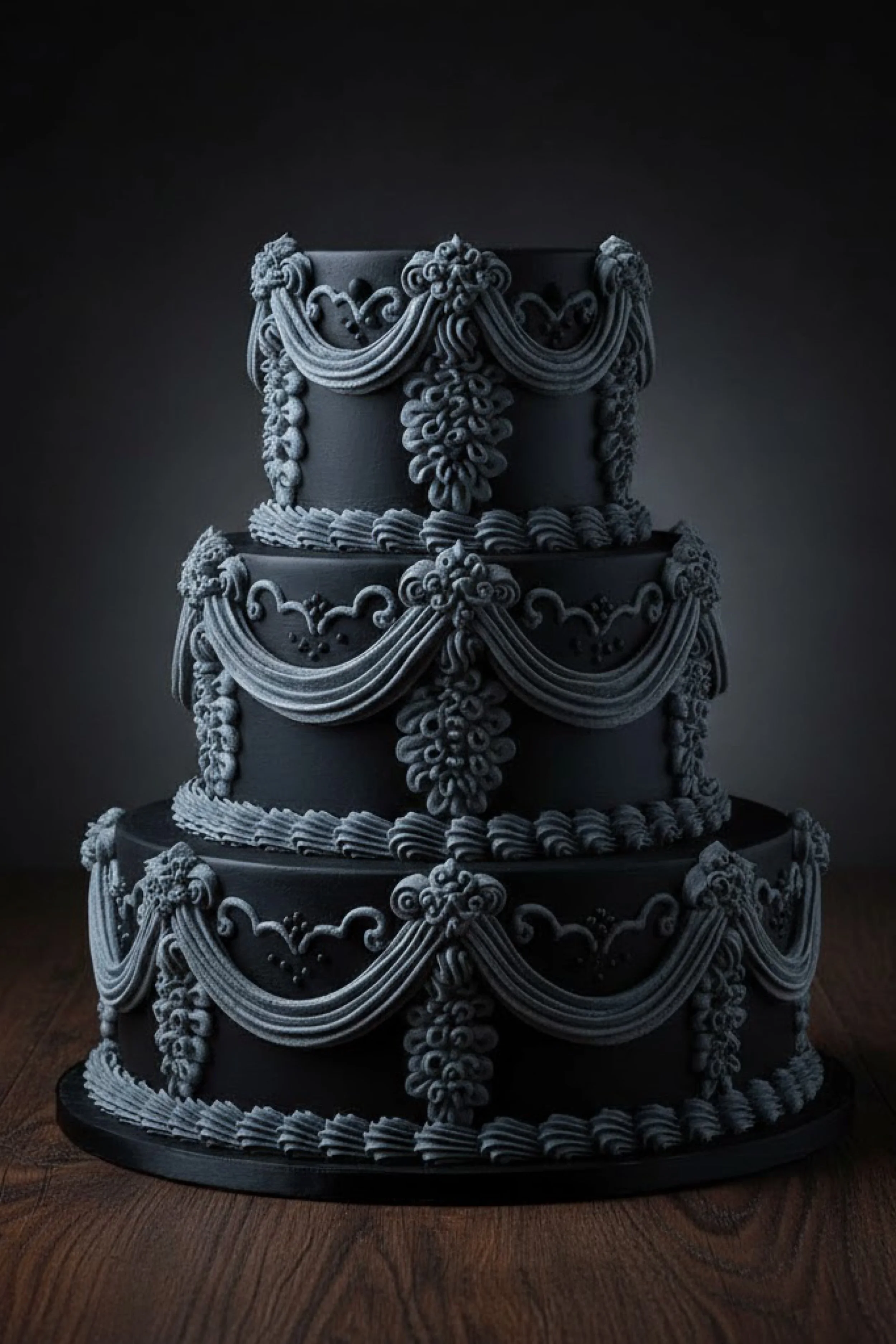 This cake is a dramatic three tier stack in a matte black buttercream finish, creating a bold stage for charcoal gray Lambeth piping. Swags, ornate scrolls, and dense central applique motifs build a sculptural look that feels like vintage architecture translated into frosting.