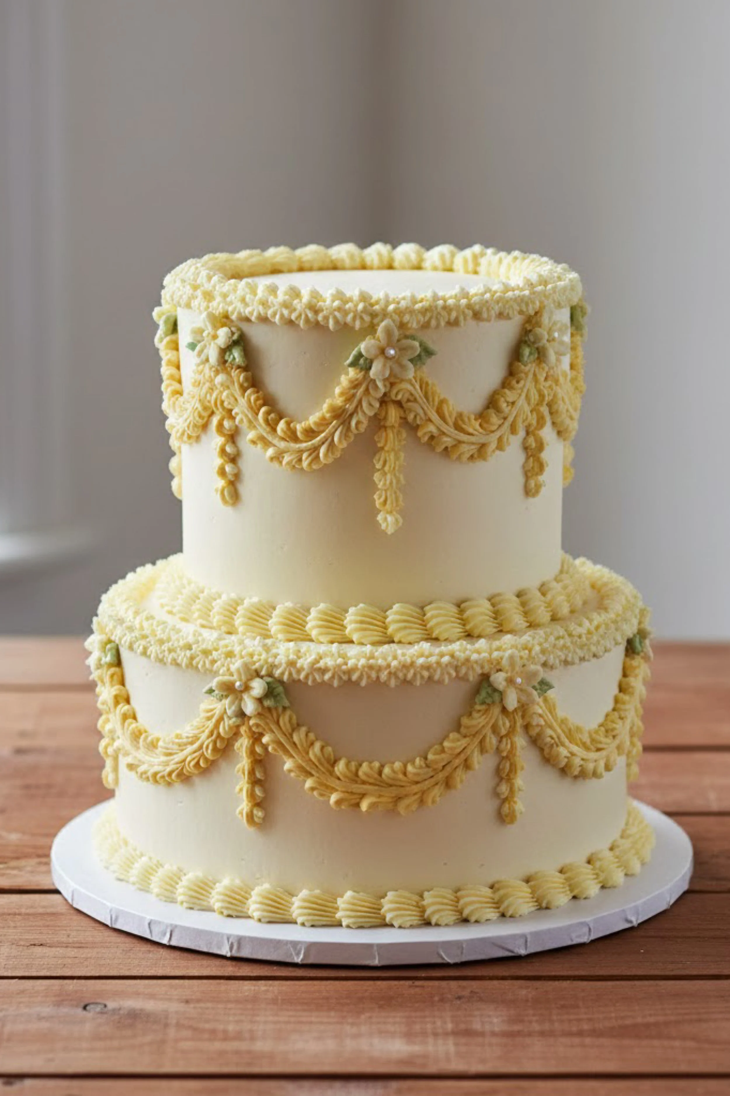 This two tier cake uses a smooth ivory buttercream base with buttery yellow Lambeth swags that feel cheerful and refined. The piping is focused on draped garlands, braided borders, and tiny flower accents with pale green leaf details, giving the whole design a garden party freshness.