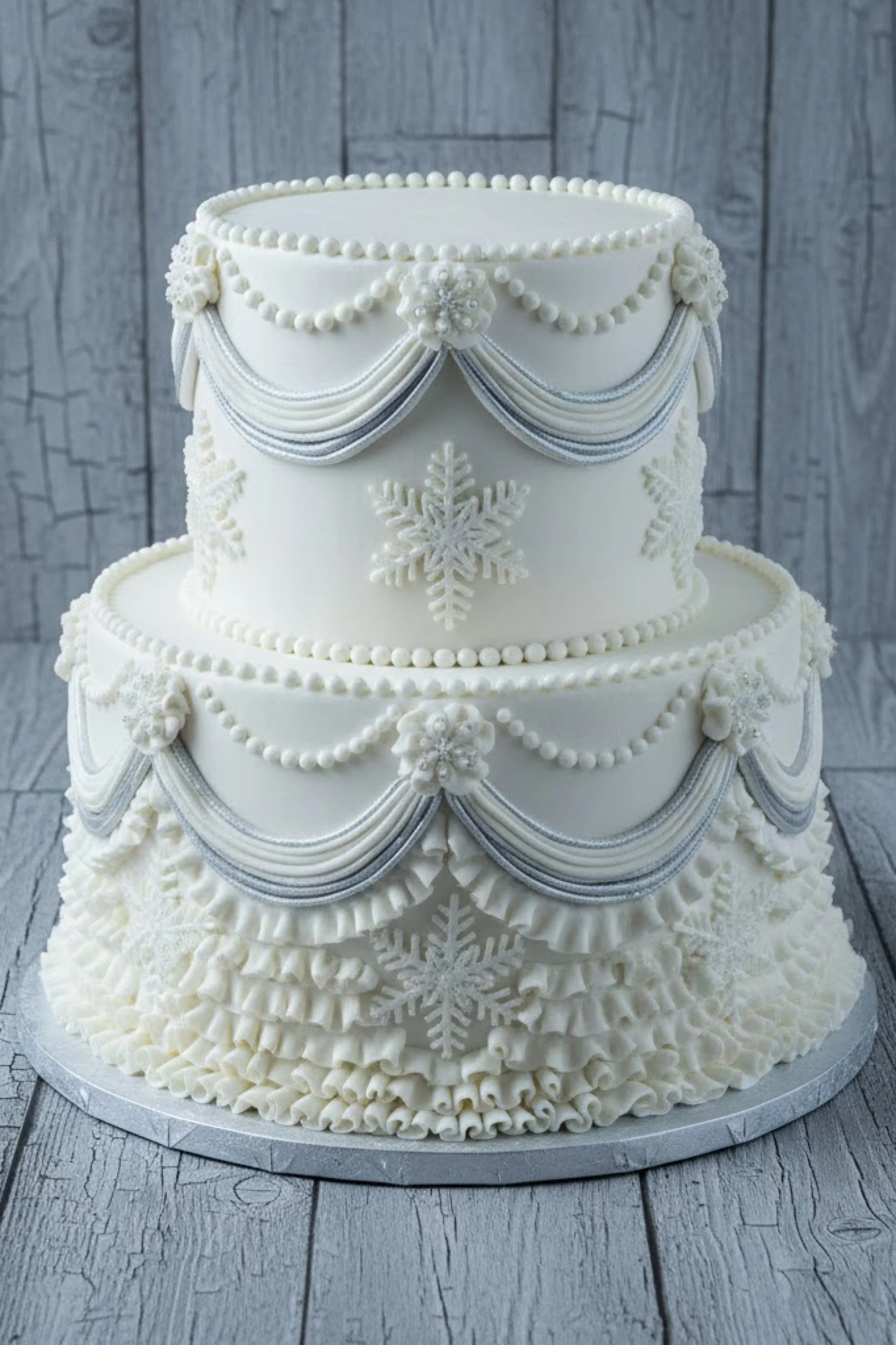 Snowflake motifs appear on both tiers, centered like appliqué medallions, while the base tier is finished with a dense ruffled skirt that feels like soft fabric. Small floral rosettes anchor the swag points, giving the cake a formal, classic presence.