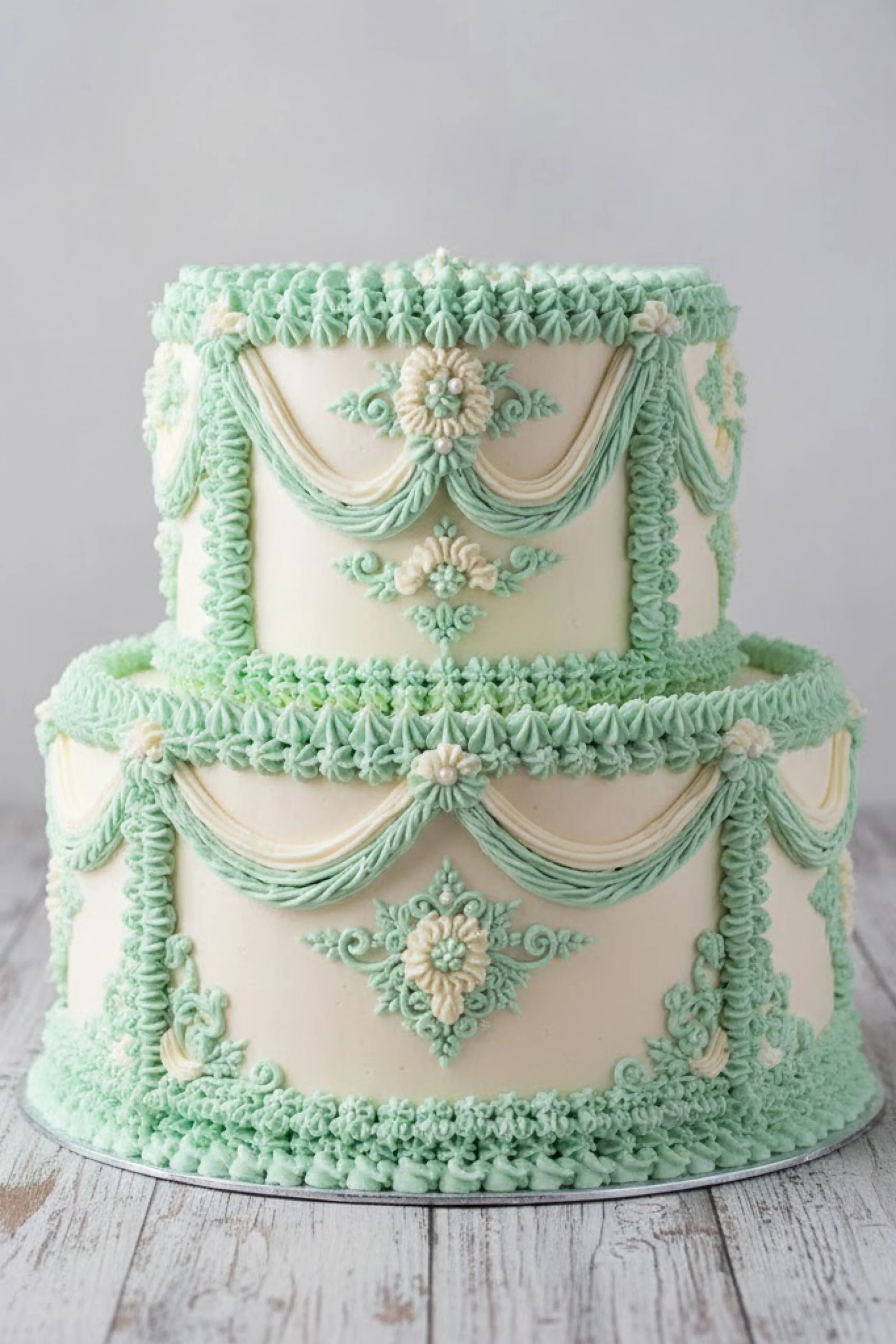 This two tier round cake is finished in ivory buttercream with mint green Lambeth piping that frames each tier like a picture. The top edges feature small star like piping, while the sides carry draped swags and ornate cameo style medallions.