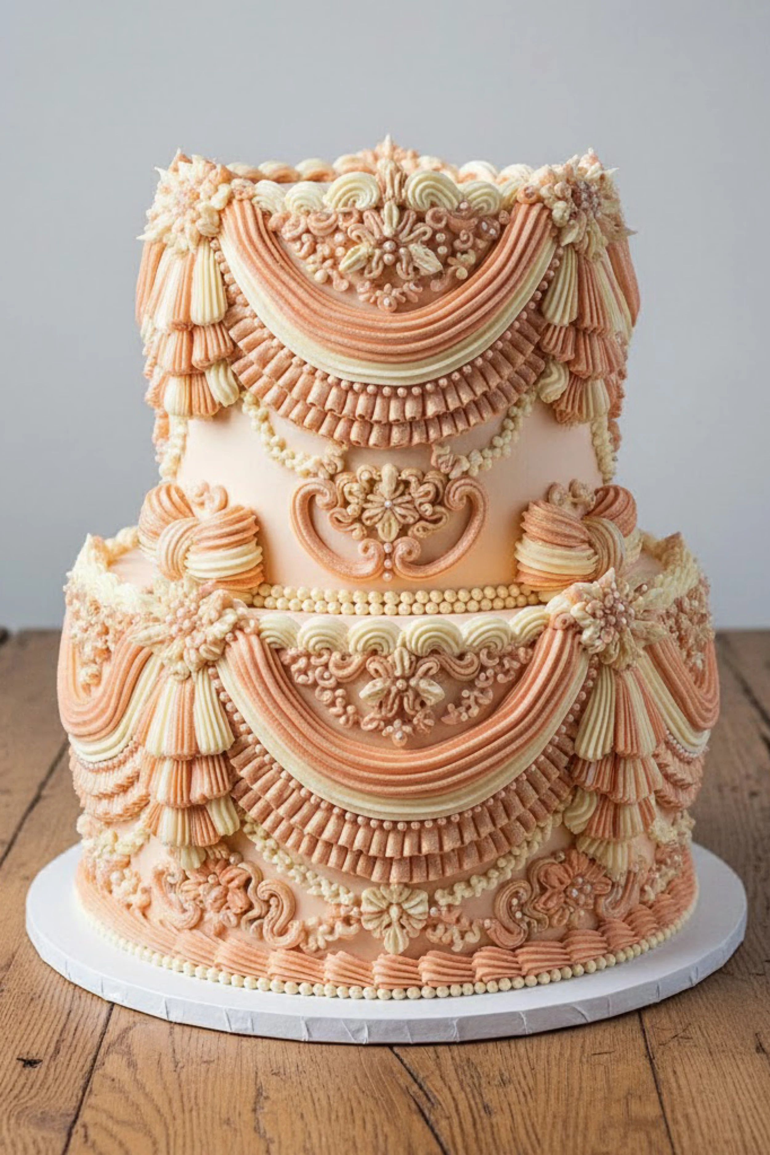 This two tier round cake is a showpiece of dense Lambeth piping in apricot, cream, and soft peach. The buttercream is smooth beneath the decoration, with dramatic swag drapes layered over ruffled hems and pearl borders.