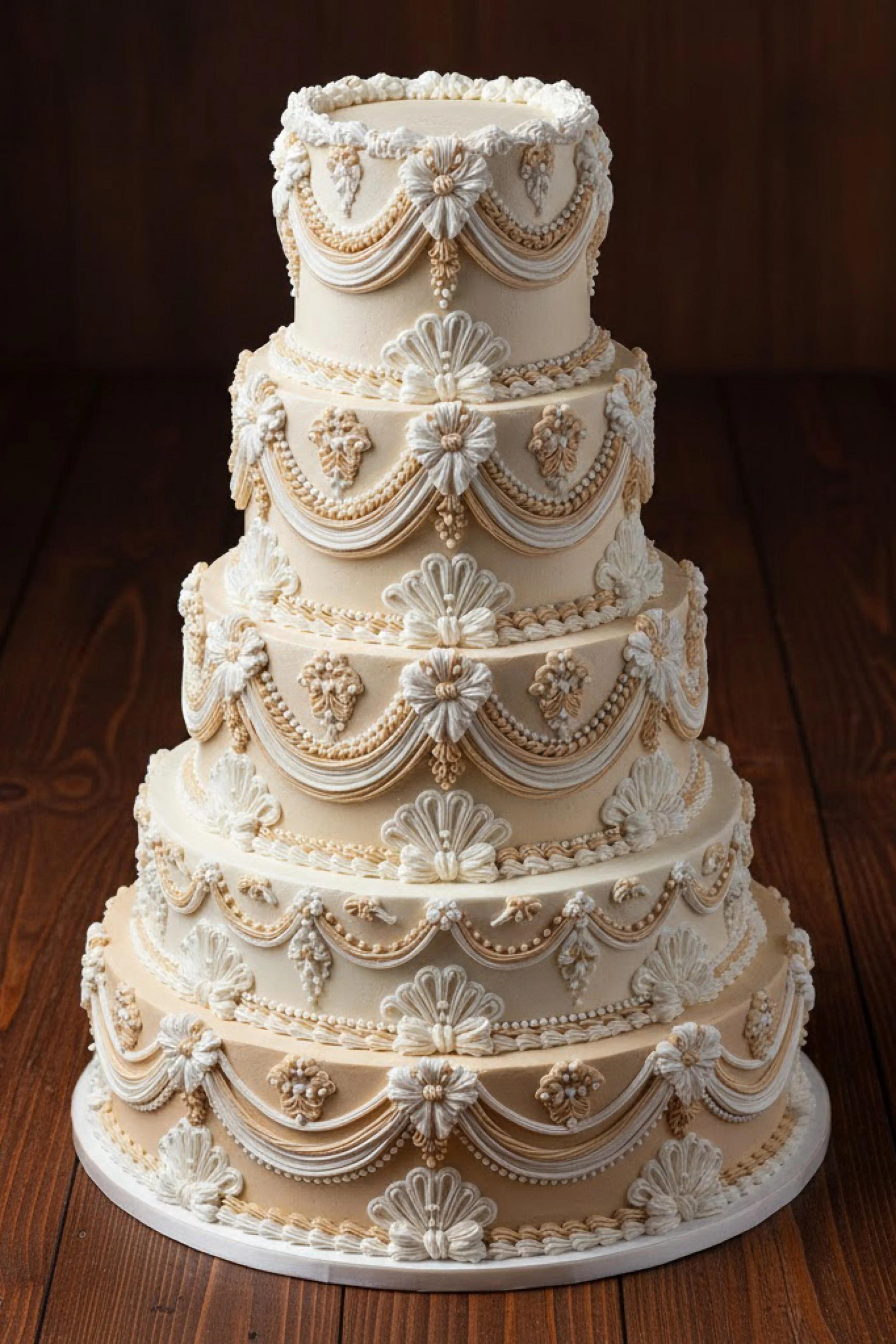 This towering multi tier round cake is finished in warm ivory buttercream with champagne toned piping that feels formal and grand. Each tier features layered Lambeth swags, pearl borders, and ornate floral flourishes placed like jeweled accents.