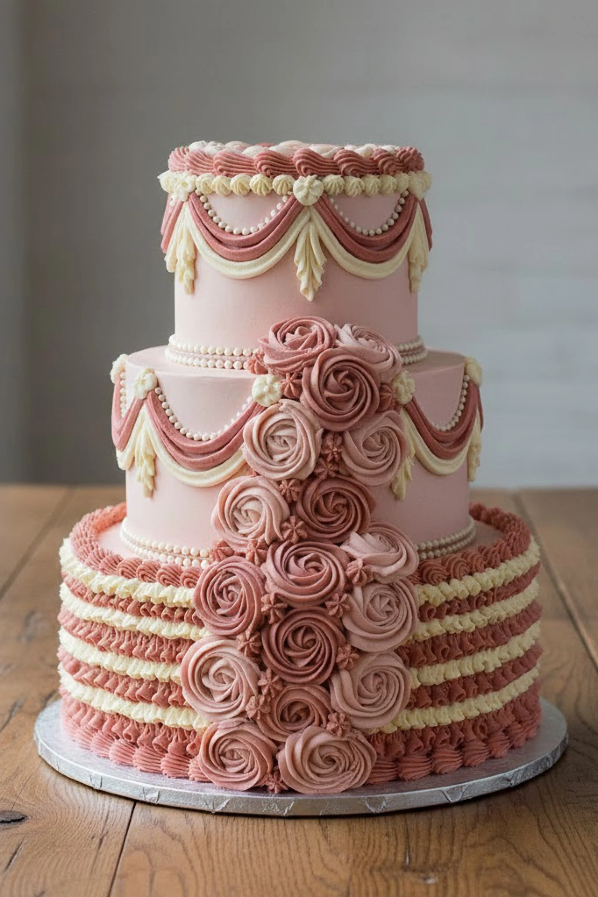 Each tier features dramatic Lambeth swag garlands with ruffled trim and shell piping, alternating between cream and rose for a layered effect. The top tier keeps the motif tighter and more delicate, while the middle and bottom tiers go fuller with deeper ruffles for a romantic, vintage statement.