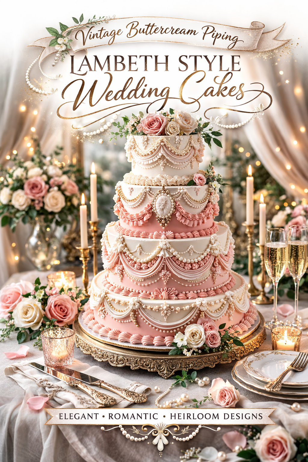 Vintage buttercream piping Lambeth style wedding cakes are all about swooped garlands, ruffles, pearls, and sculpted flourishes that read like couture details on a gown. The look is ornate yet soft, with raised piping that creates depth and shadow across each tier.