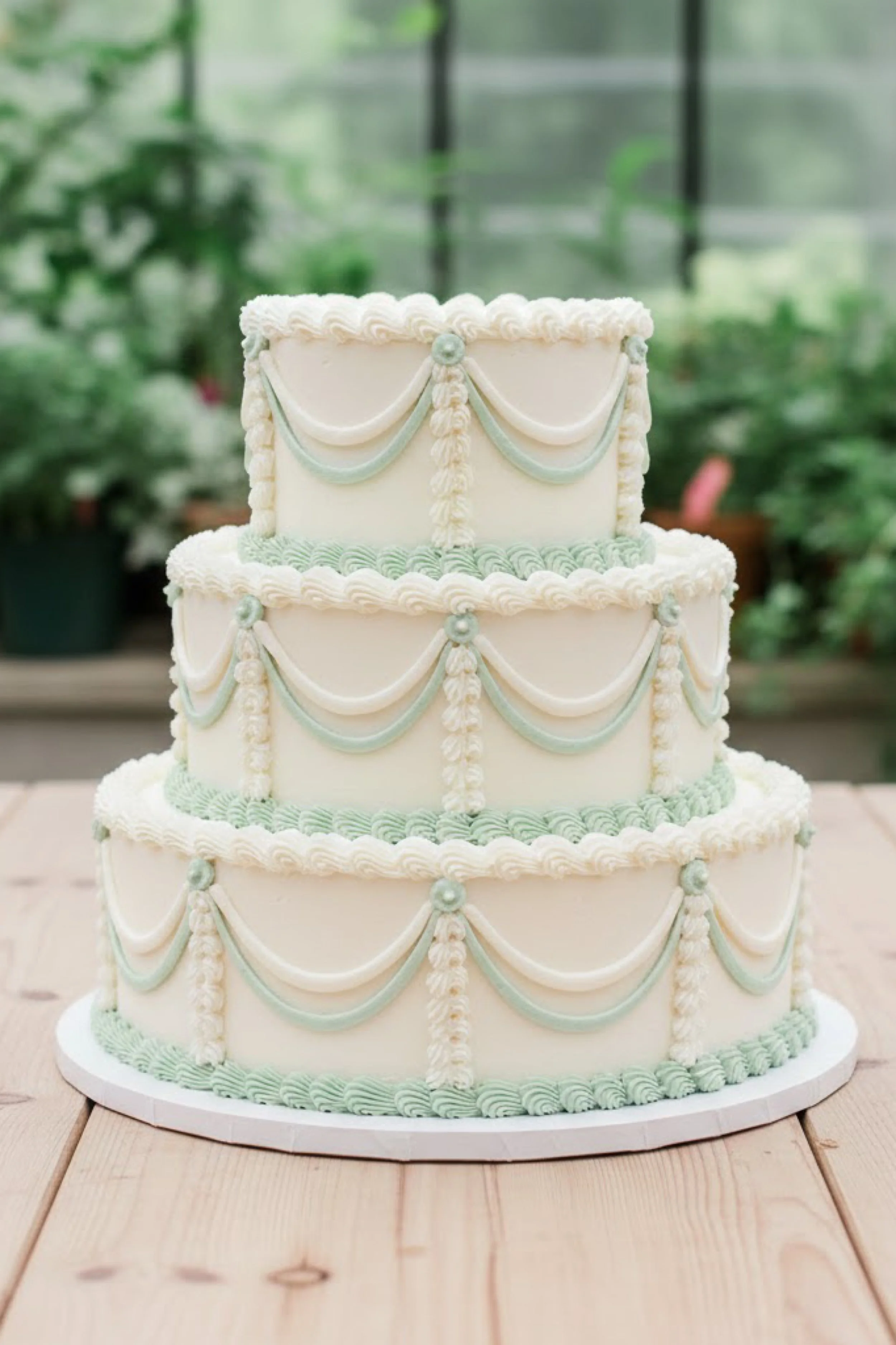 This three tier round cake pairs crisp ivory buttercream with mint green Lambeth swags for a fresh garden feel. The tiers are tall and clean, with piped borders at each edge and a repeating drape motif that gives the design a refined rhythm.