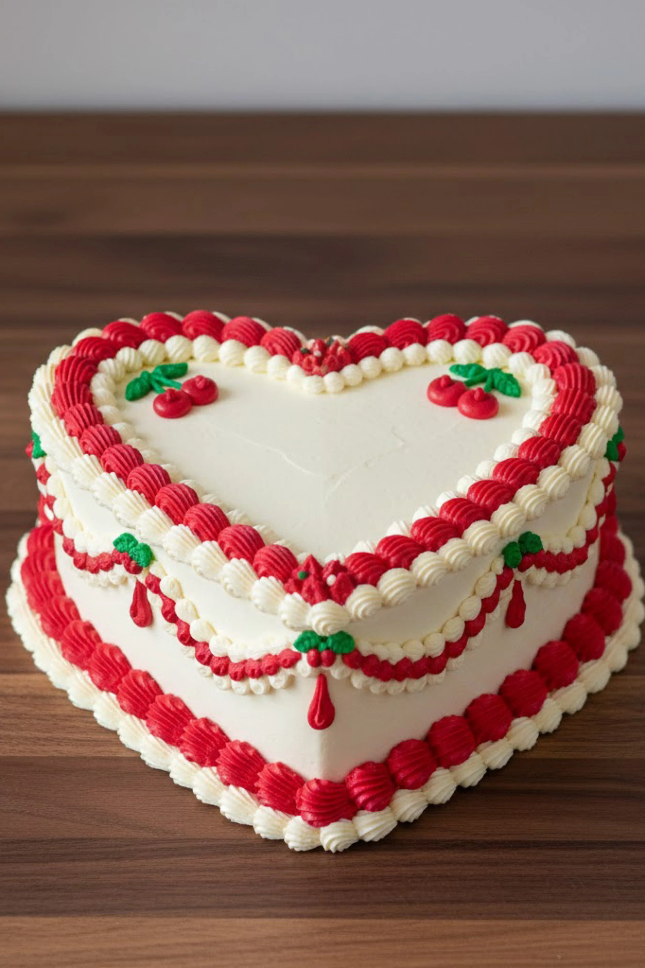 This bold heart shaped cake is finished in smooth white buttercream with classic Lambeth borders in cherry red and vanilla. The top edge is framed with alternating shell piping, and tiny piped cherries with green leaves add playful vintage charm.