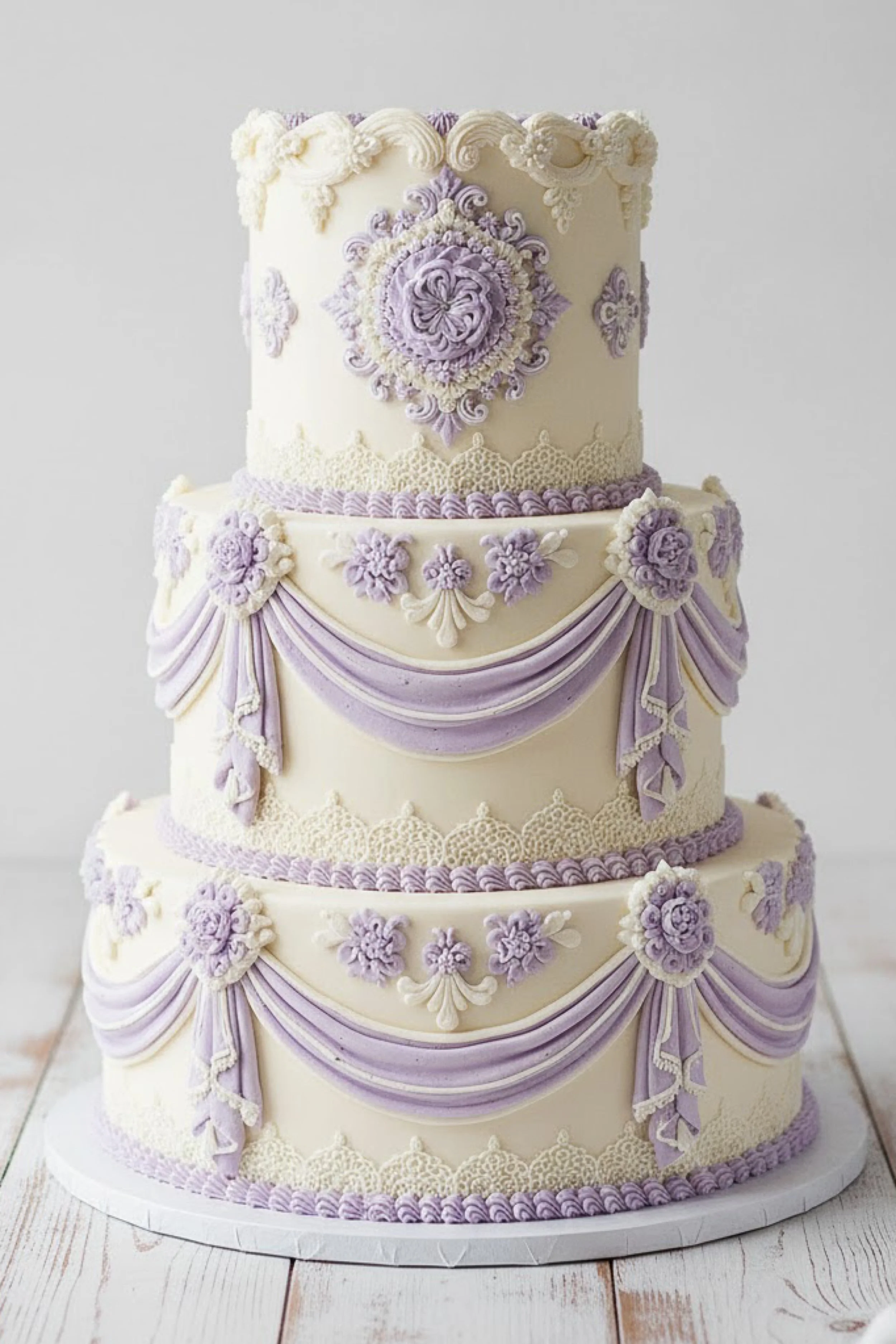 This three tier round cake pairs antique white buttercream with lavender Lambeth drapes and ornate floral medallions. The tiers are tall and smooth, with piped lace like borders at the base of each tier and gathered drapes that feel like soft fabric.