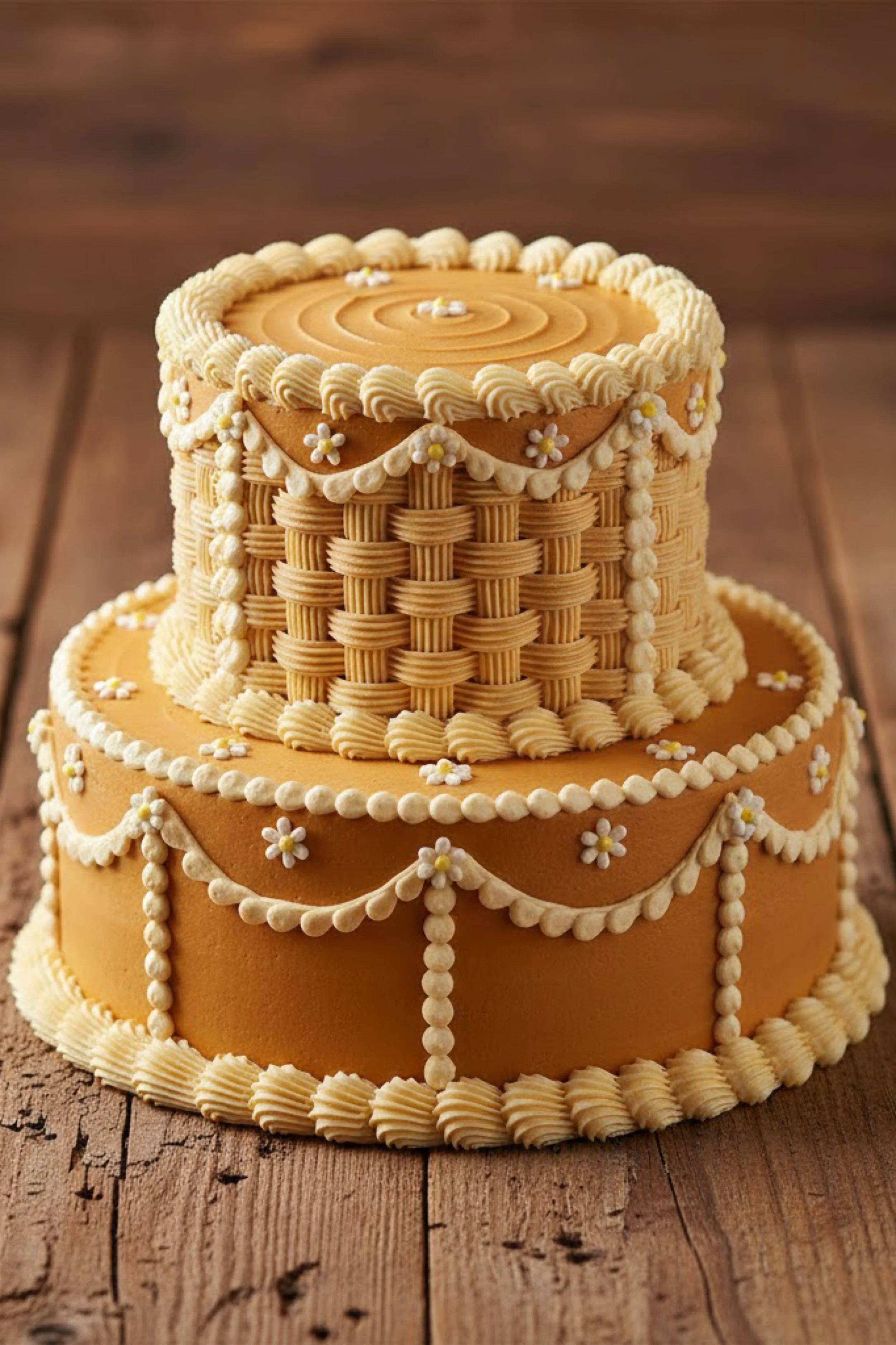This two tier round cake brings a warm honey colored buttercream finish with a basketweave texture on the top tier. The base tier stays smooth and bold, framed with pearl piping and classic scalloped swags finished with tiny daisy accents.