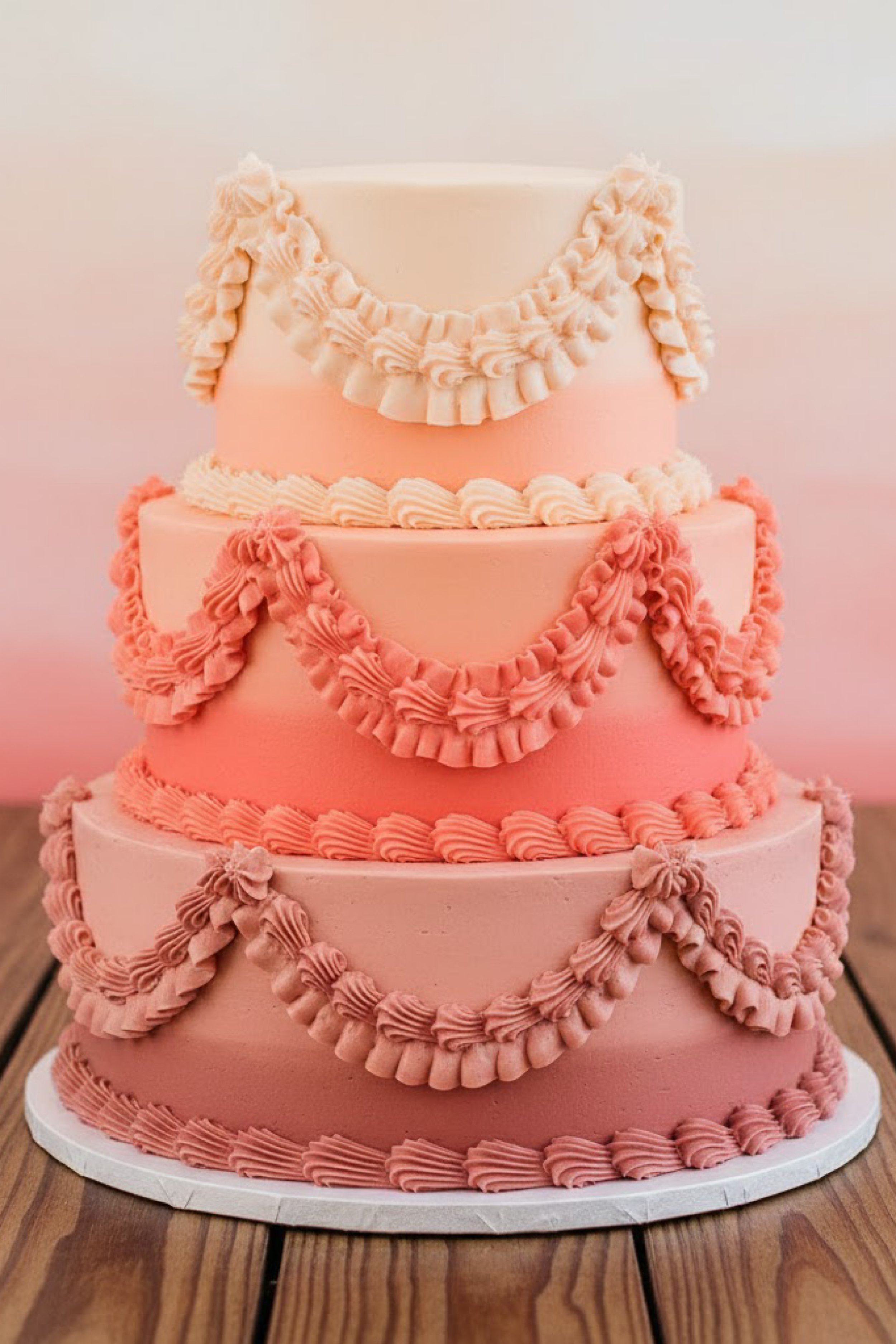 Lean into the sunset palette by choosing an ivory linen with a warm undertone, and place the cake on a clean white stand so the ombre reads true. A simple backdrop in pale peach or warm neutral will keep the swags crisp in photos.