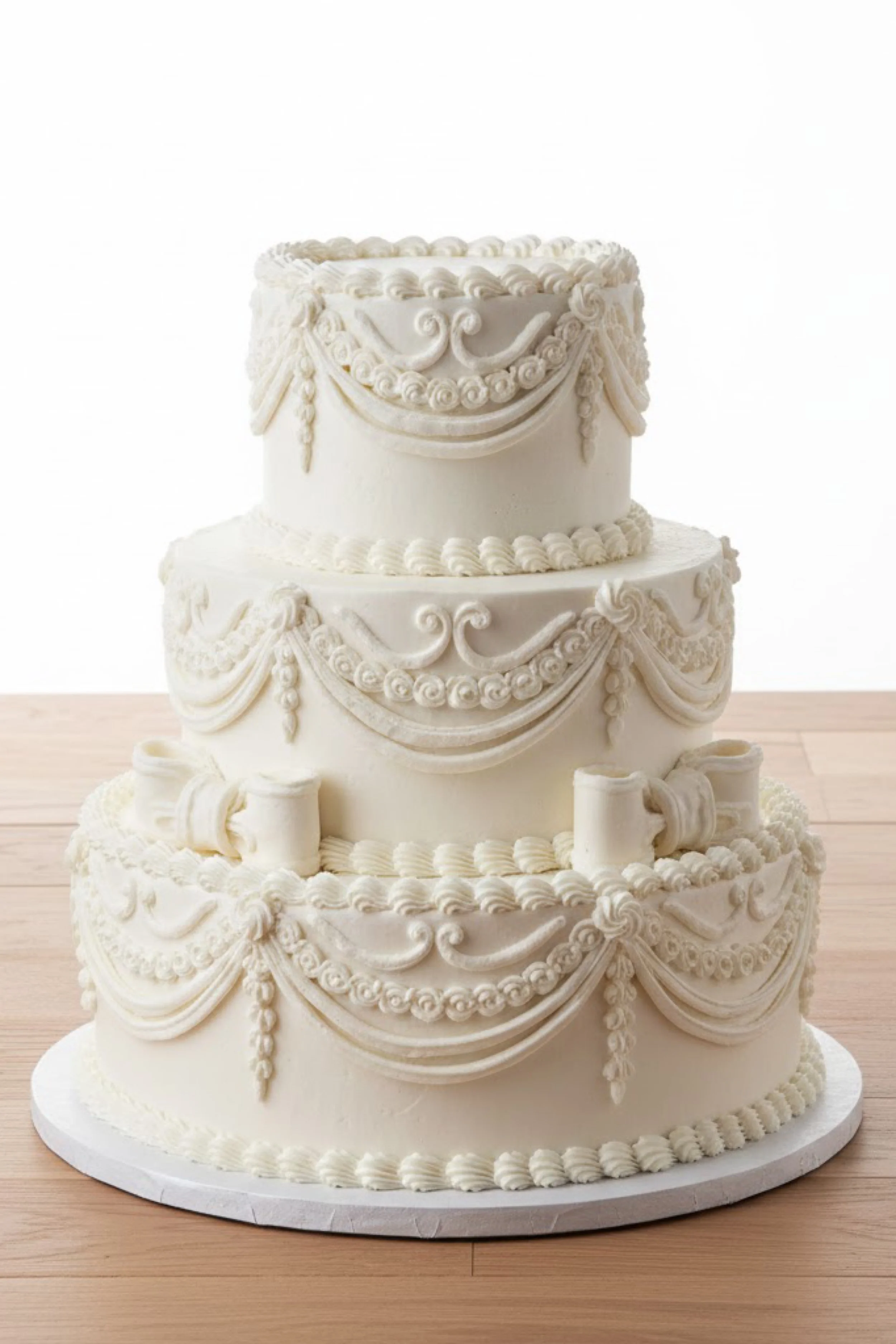 Pair this cake with a minimal linen in warm white or antique ivory so the piping remains the hero. A round pedestal stand with a subtle profile keeps the look elevated without competing with the detail, and a simple backdrop like soft drape panels or a clean wall will make the swags feel even more dramatic.