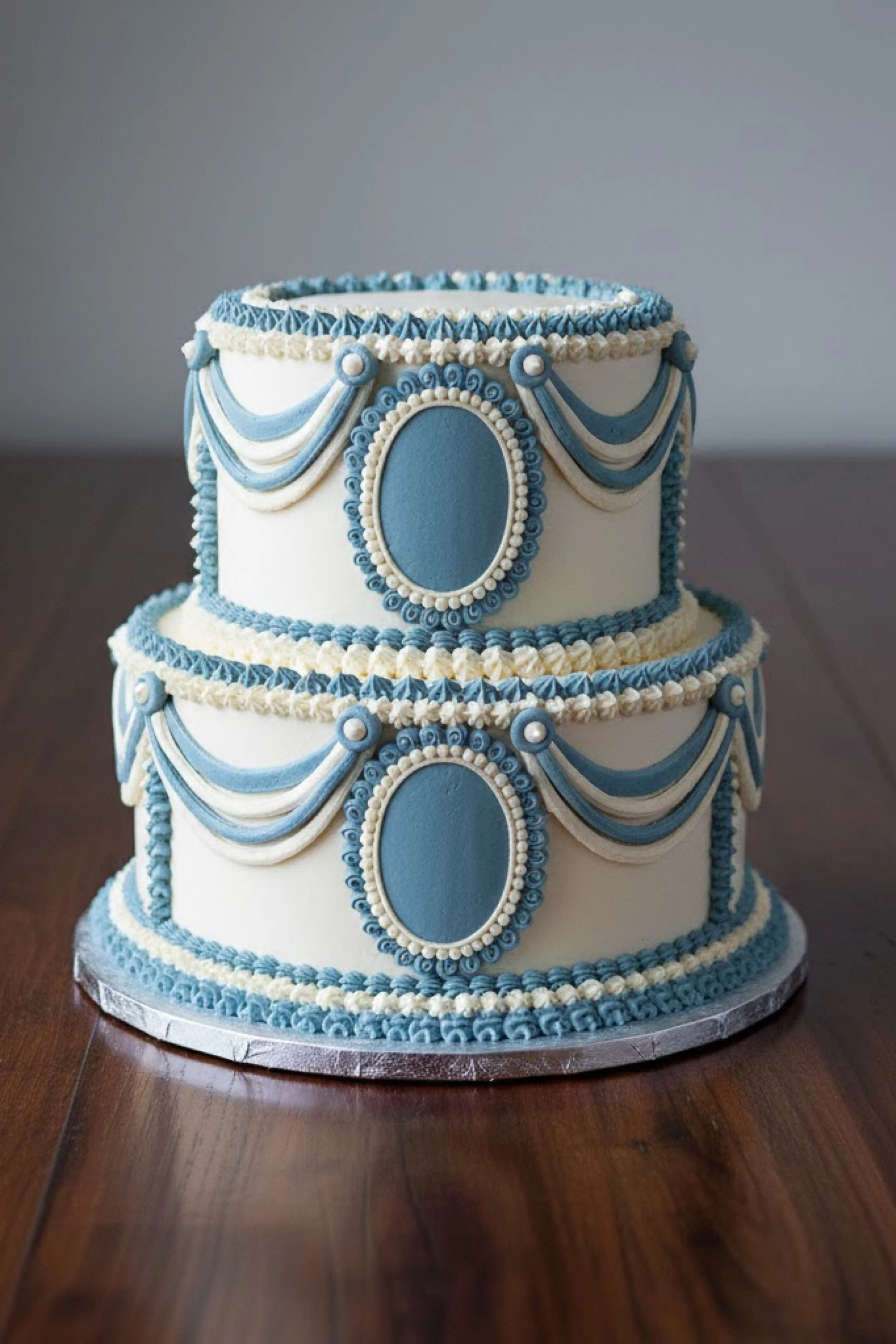 This two tier round cake feels like a vintage portrait brought to life, with a crisp white buttercream base and powder blue accents. Each tier features a central oval cameo plaque framed with delicate pearls and micro scroll piping that reads as jewelry like detail.