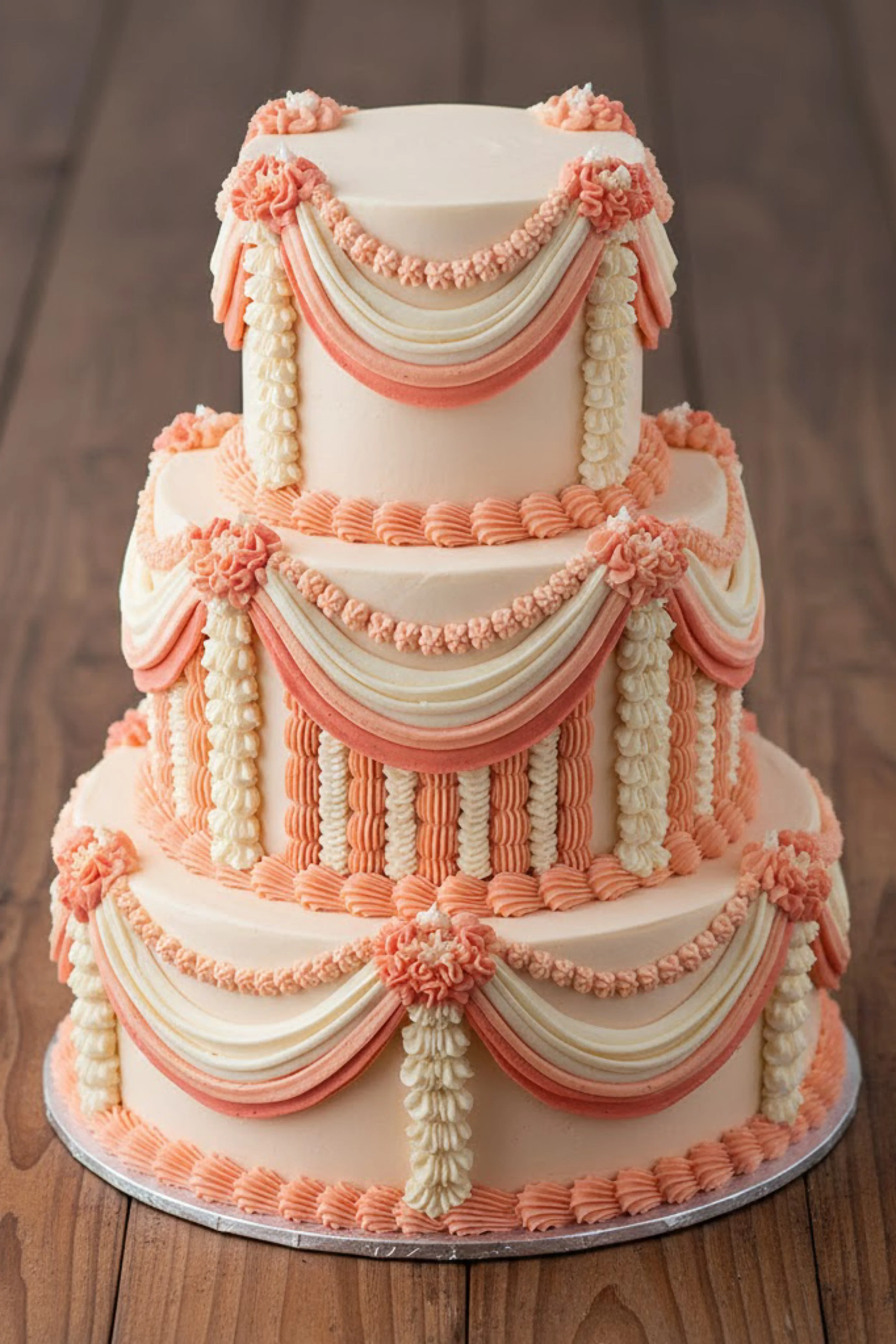 The buttercream finish looks smooth and clean, allowing the garlands to read like fabric. The peach tones feel playful yet still elegant, especially paired with the crisp white layers that keep the palette airy.