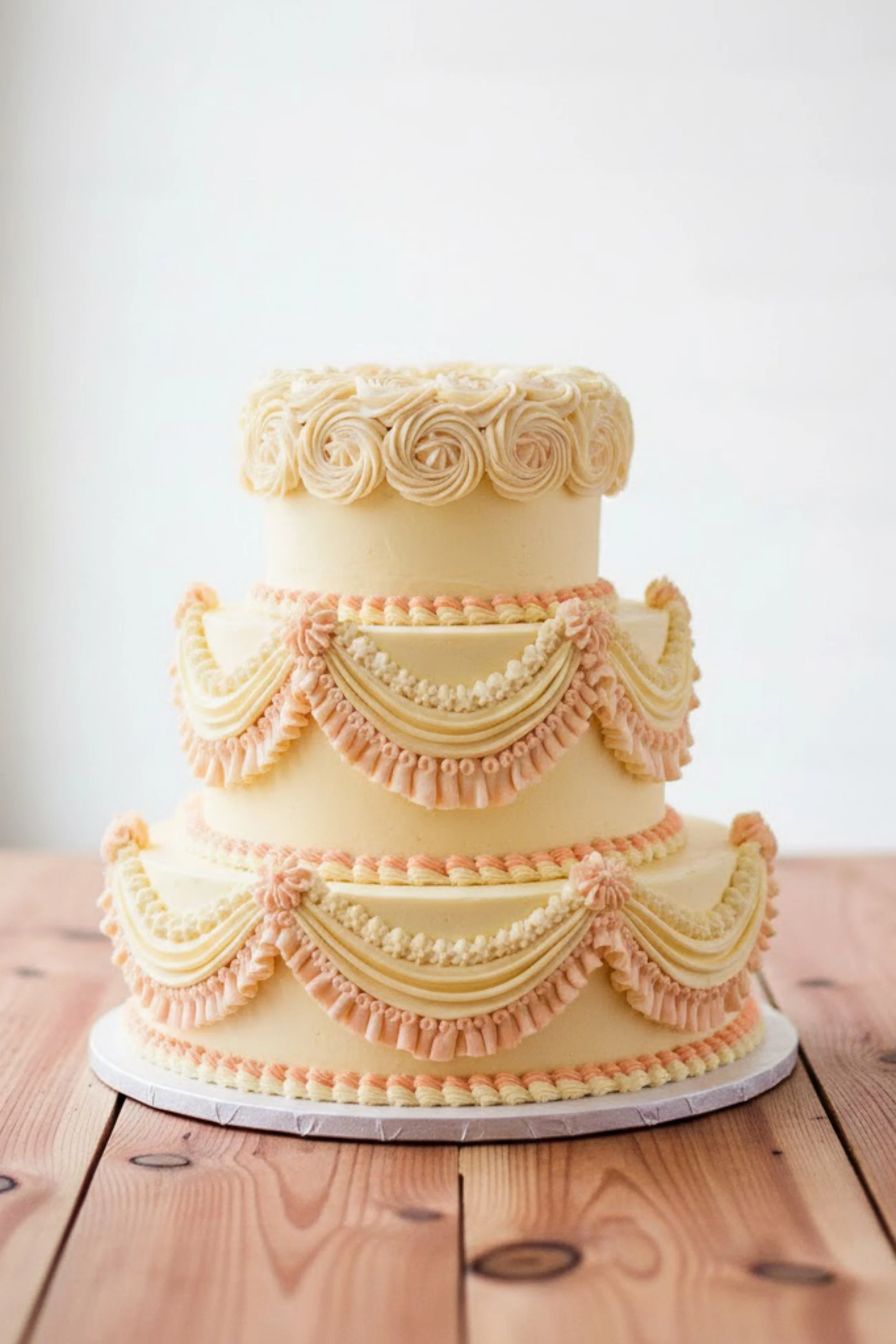 Vintage buttercream piping Lambeth style wedding cakes feel timeless and fresh because they turn simple buttercream into sculptural texture that photographs like couture. Whether you go monochrome ivory or lean into soft color, the swags and borders create instant romance without needing heavy decoration.