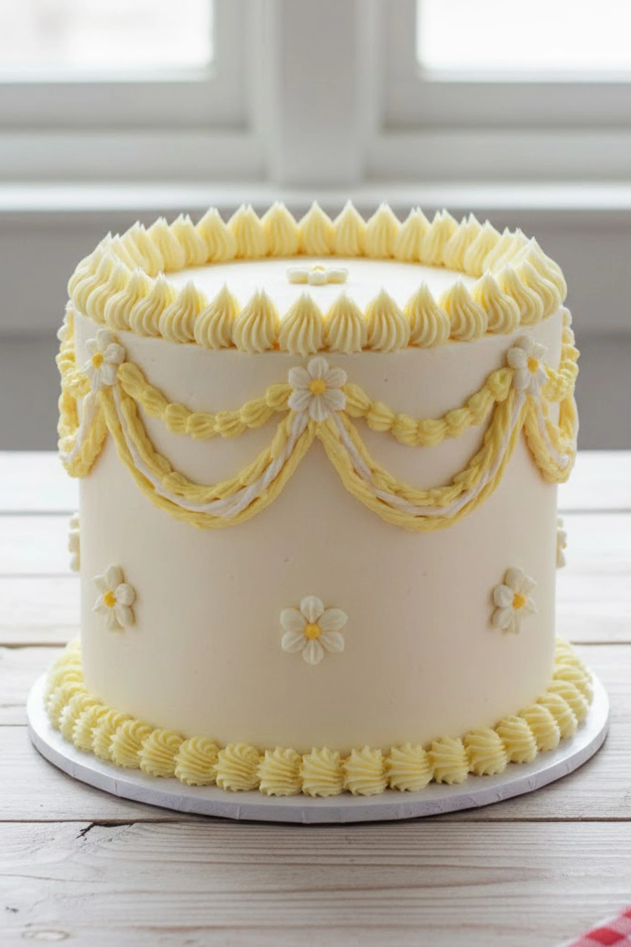 This single tier round cake keeps the Lambeth language sweet and minimal, with butter yellow garlands draped in soft scallops. Petite daisy motifs appear at the swag points and on the sides, adding a cheerful finish that feels bright and fresh.
