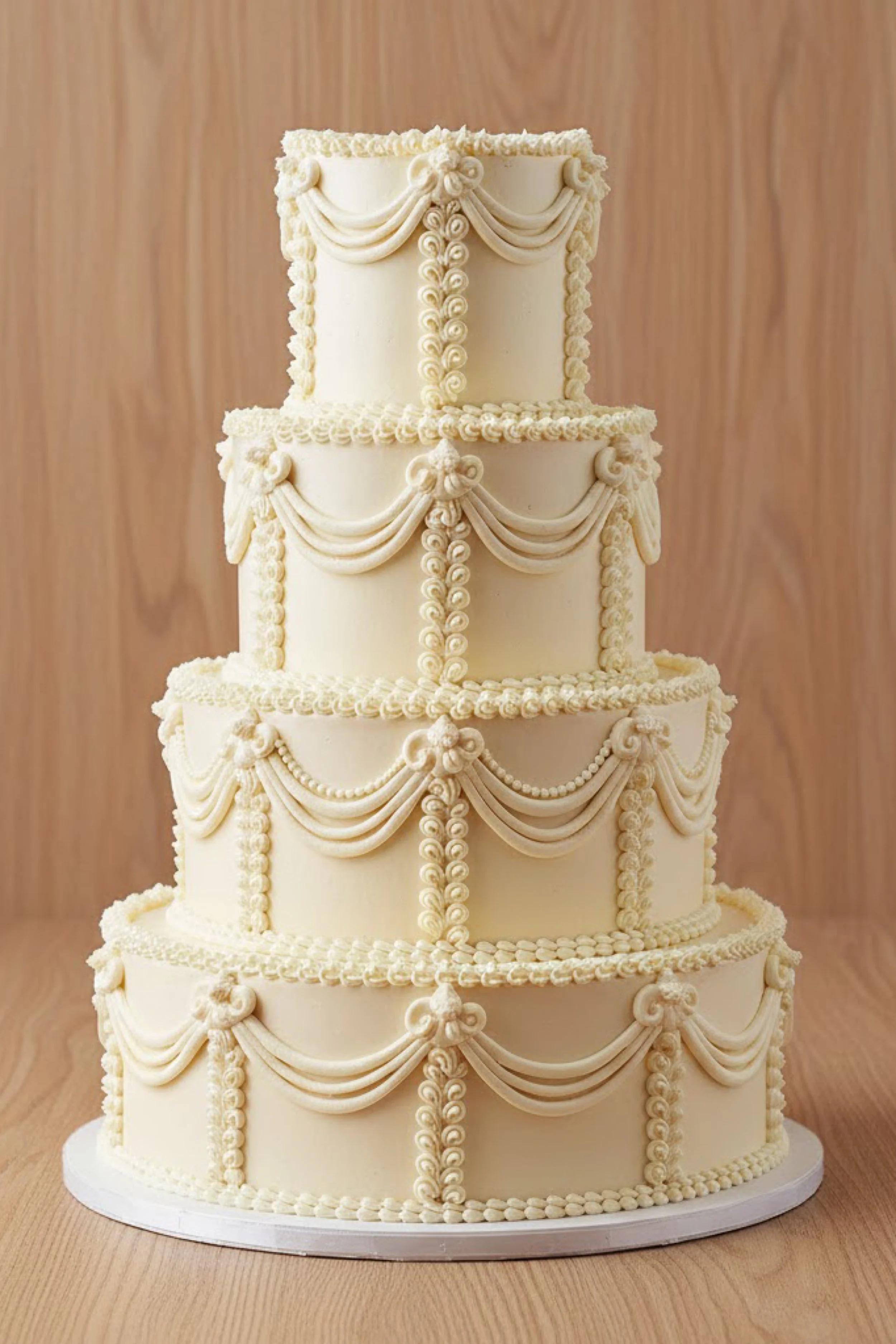 This tall four tier round cake is pure classic drama, with smooth ivory buttercream and evenly spaced Lambeth swags on every tier. Vertical piped columns anchor the design, while bead borders and shell trims give the edges a couture finish.