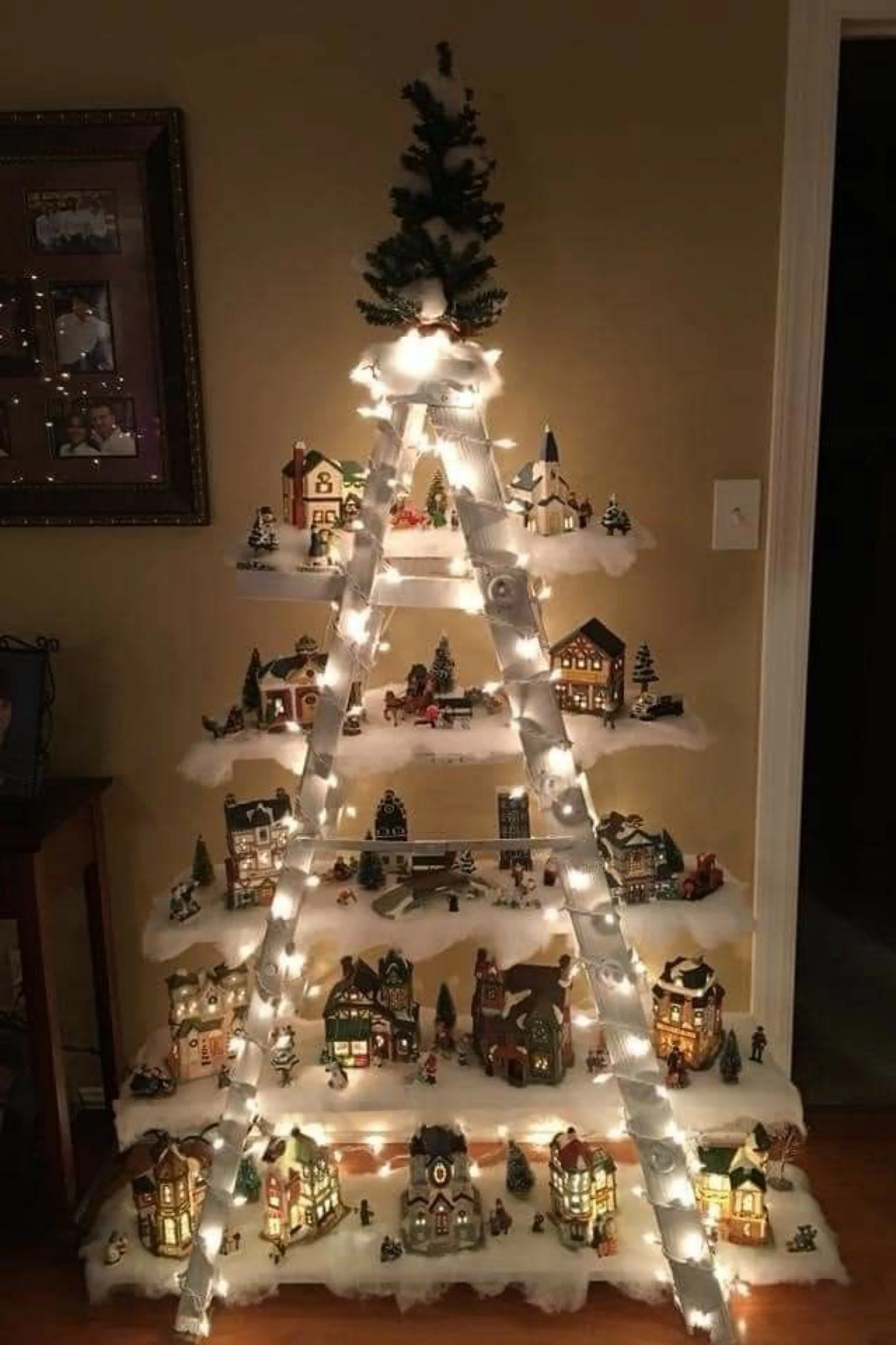The charm of a Christmas village lies in its ability to capture the stillness and wonder of winter in miniature form. These ladder tree displays take that magic to new heights—literally. Transforming ladders into illuminated tiers of holiday nostalgia, each one becomes a glowing centerpiece filled with light, texture, and story. From rustic wood tones to crisp modern whites, from warm hearth scenes to cathedrals in snow, every creation tells its own tale of December joy.
