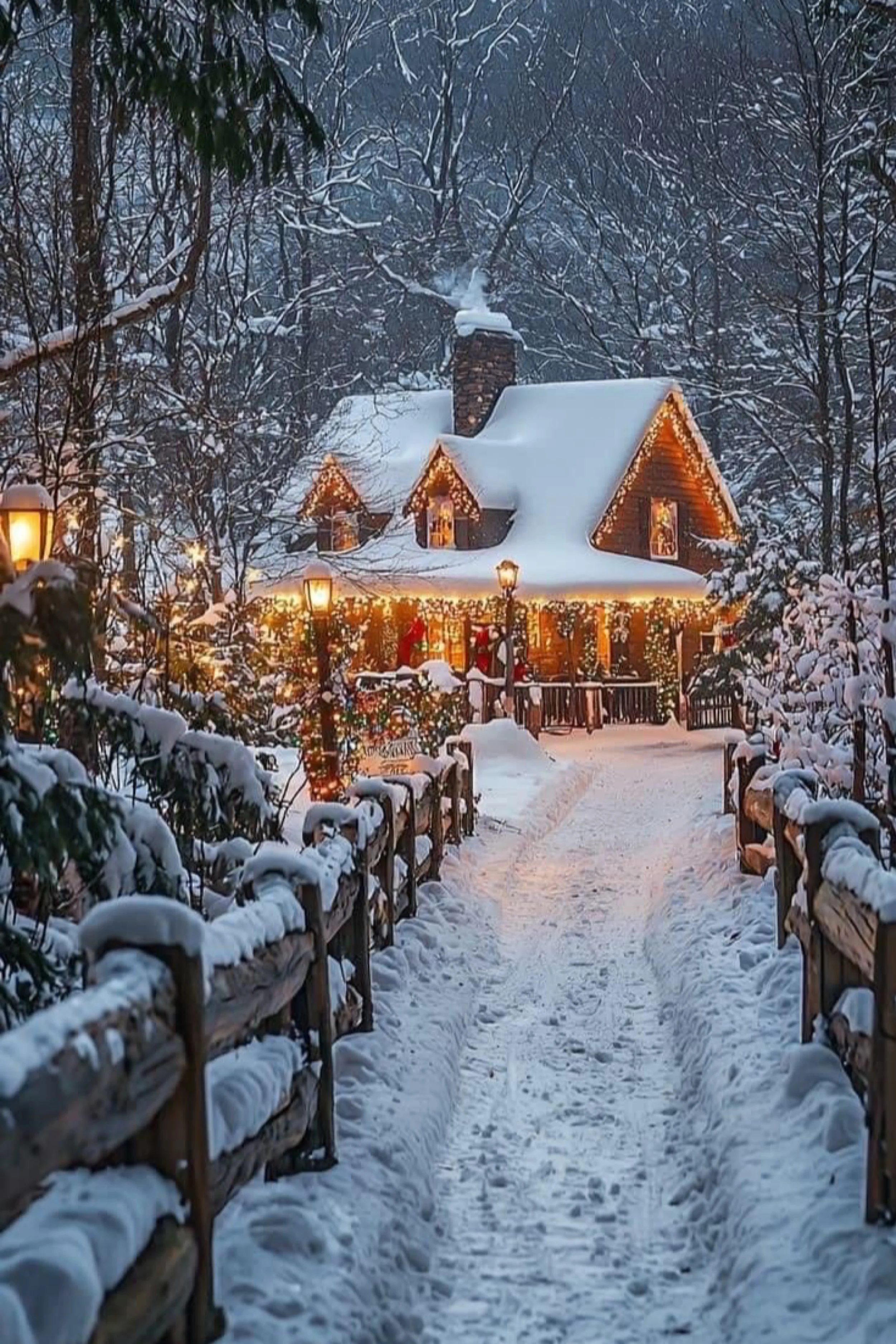 A small wooden bridge dusted with snow arches gracefully toward this warm and inviting home. Strings of golden lights trace the railings, leading like breadcrumbs through the twilight. The cottage itself glows with a gentle amber hue, its frosted windows promising comfort beyond the cold. Wreaths, garlands, and candlelight make this retreat feel like the heart of winter’s dream — soft, romantic, and timeless. Every detail speaks to care and tradition, the kind of place where cocoa simmers on the stove and laughter drifts between snowflakes.
