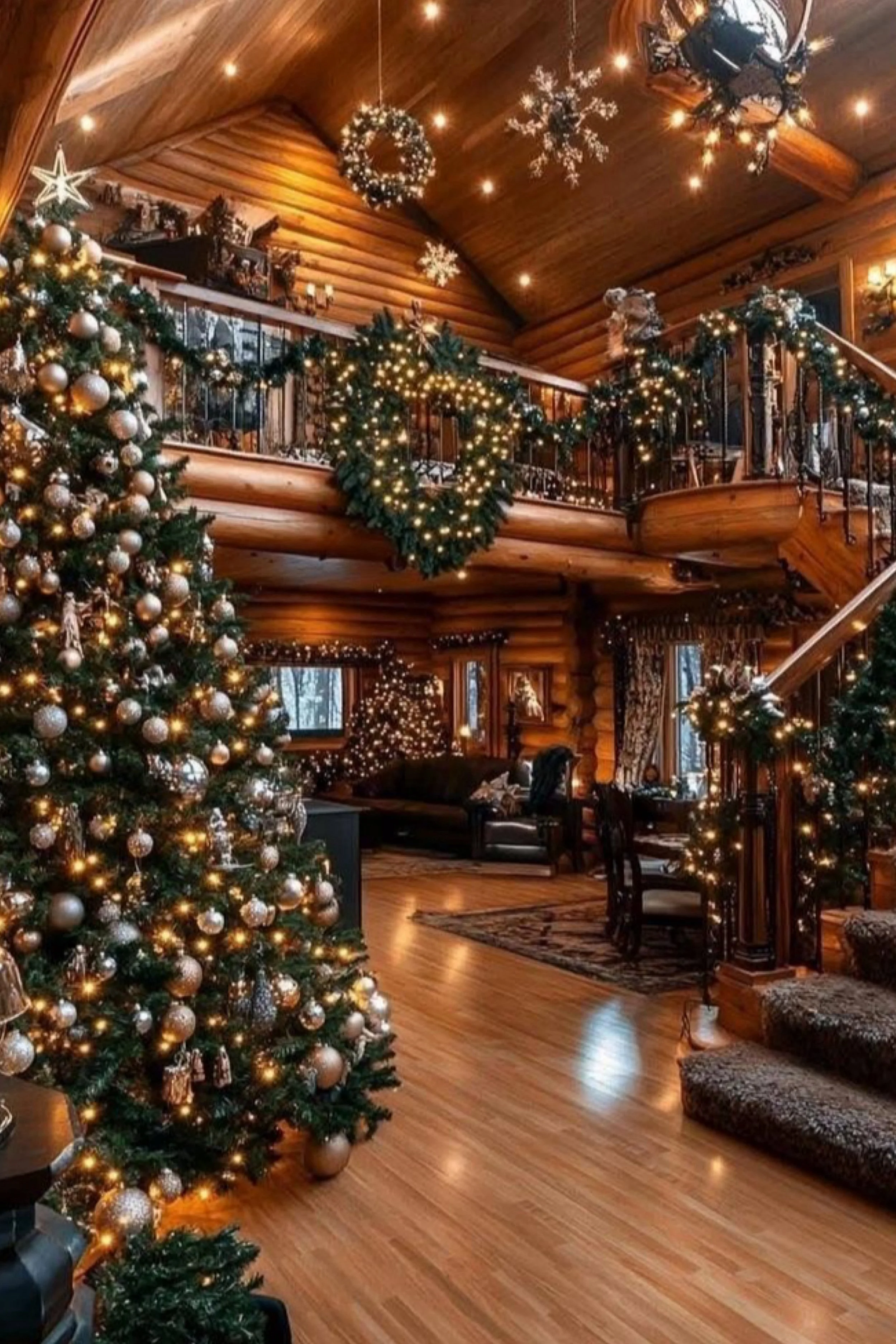 The deep indigo twilight outside contrasts beautifully with the amber warmth within this grand retreat. Massive log beams frame two Christmas trees—one beside the fire, one reflected in the great window. Garlands hang from the loft railings above, draped in ornaments that shimmer like winter stars. The space feels alive with color and light, balanced between the majesty of nature and the intimacy of home. Every flame, every reflection, every glint of gold turns the room into a living painting.