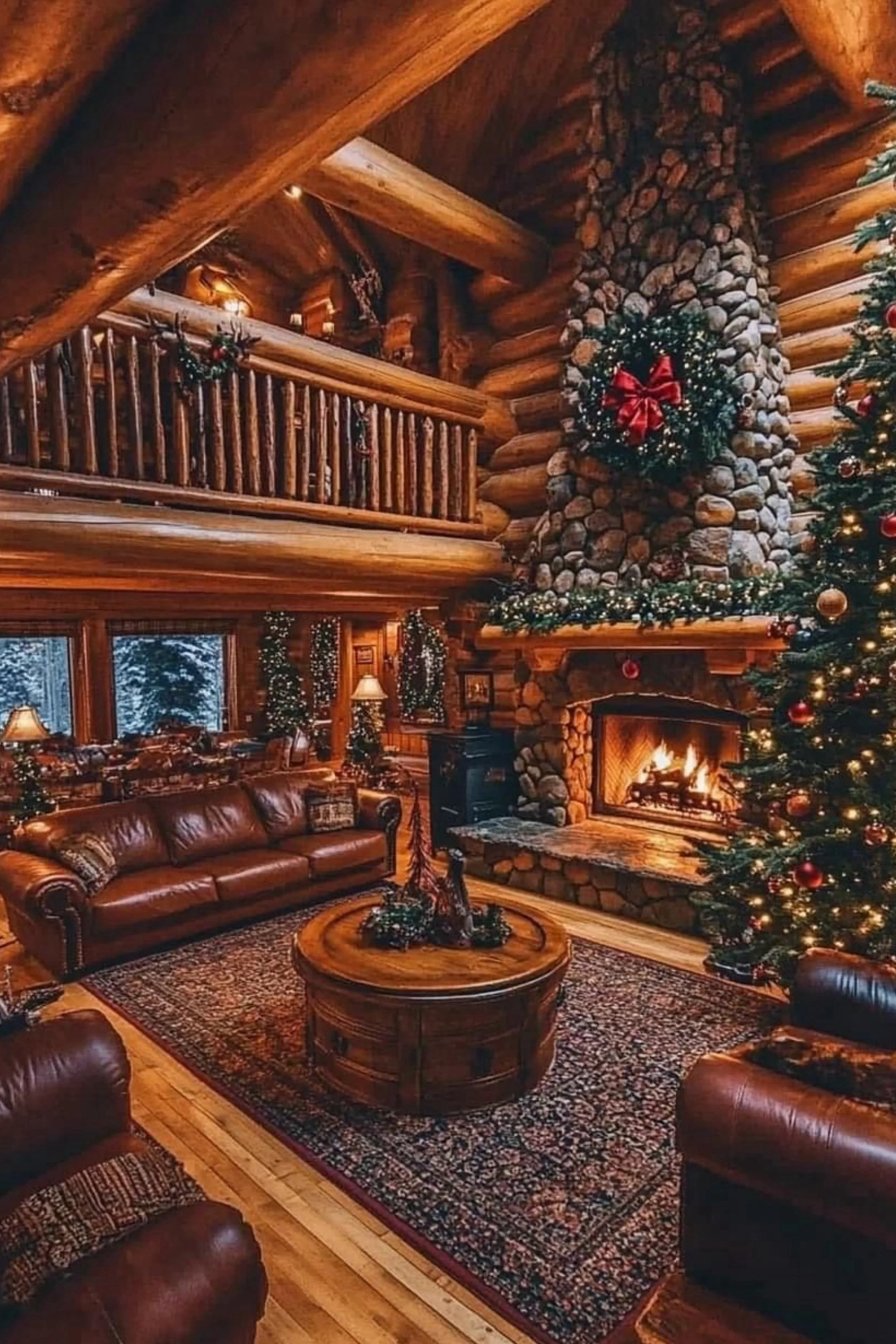 In this soaring lodge, every timber beam tells a story of craftsmanship and warmth. The vaulted ceiling draws the eye upward to a cascade of pine garlands, while wreaths and ribbons tumble from the loft above. Below, the hearth glows beneath a stone mantle adorned with crimson and evergreen. Leather seating encircles the space like an embrace, and the glow of candlelight reflects across polished floors that gleam like chestnuts. The Christmas tree, alive with red ornaments and golden accents, stands sentinel beside the fire, mirroring the snow beyond the great windows.