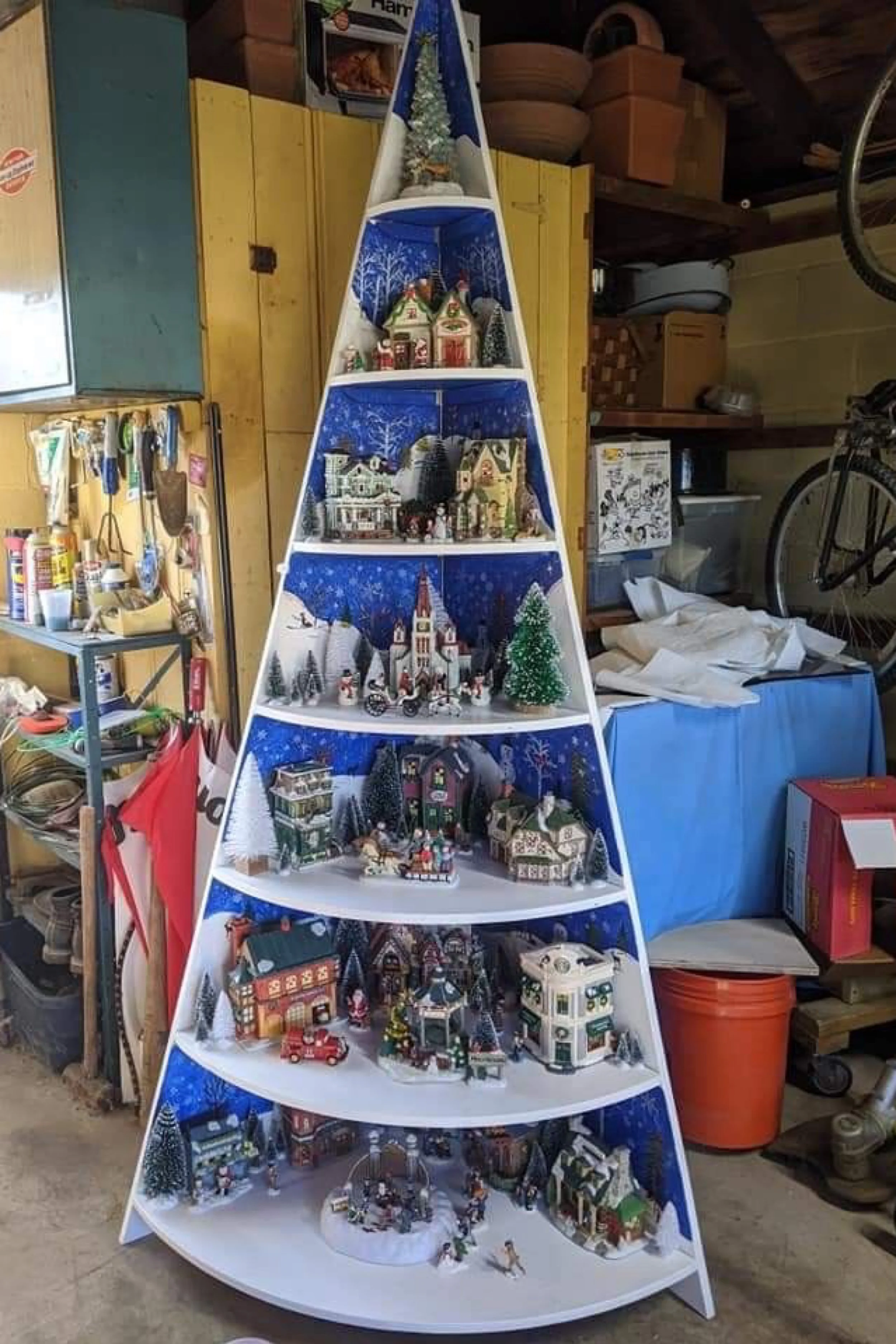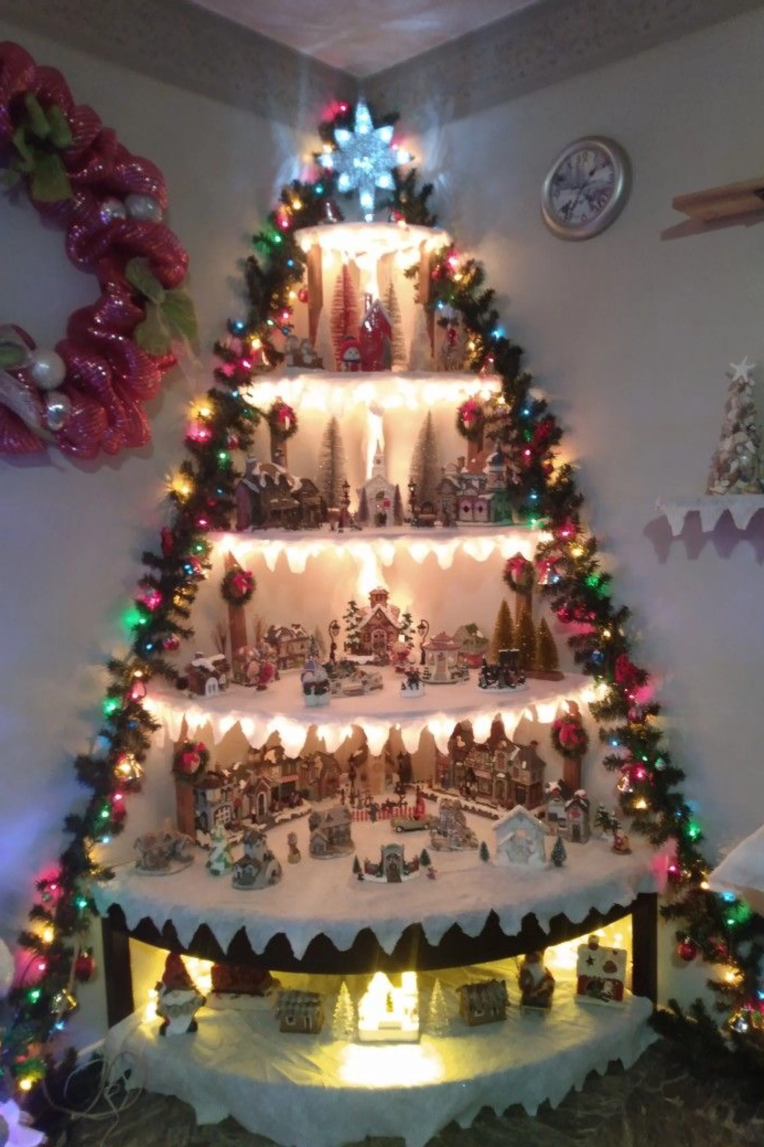 To create this look, start with a triangular or ladder-style wooden frame. Cover each shelf with white felt or faux snow batting for a soft winter base. Add miniature houses, churches, and civic buildings with warm LED lighting to bring them to life. Place smaller accessories such as benches, lampposts, and snow-dusted trees for added realism. Keep the color palette consistent—reds, greens, and golds feel timeless, but muted tones give a vintage touch. A glowing star topper completes the vertical flow, symbolizing hope and unity. Drape garland or fairy lights along one side to add depth and texture, ensuring the lights highlight, not overwhelm, the display. Finally, dust the “snow” with glitter or iridescent powder to catch ambient light. This setup becomes a living piece of art in any corner, radiating calm and Christmas nostalgia night after night.