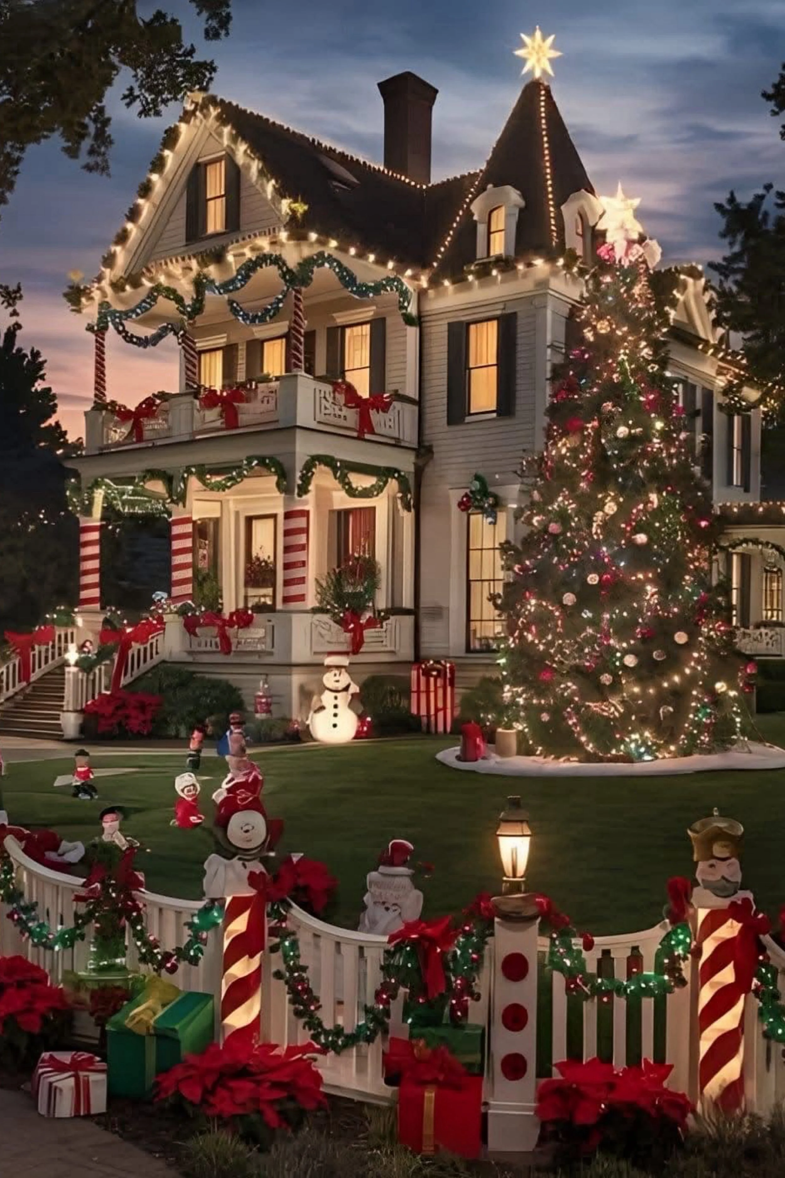 This grand home evokes the splendor of old-fashioned Christmas charm. Wrapped in garlands, bows, and candy-striped columns, every inch glows with warmth and tradition. A towering tree stands proudly in the front lawn, its lights cascading upward toward a golden star. Along the fence, nutcracker posts and garland swags tie the entire scene together, while playful figures add a sense of life and movement. The golden twilight backdrop makes the home appear timeless — a Victorian dream brought to life through careful detail and holiday devotion.