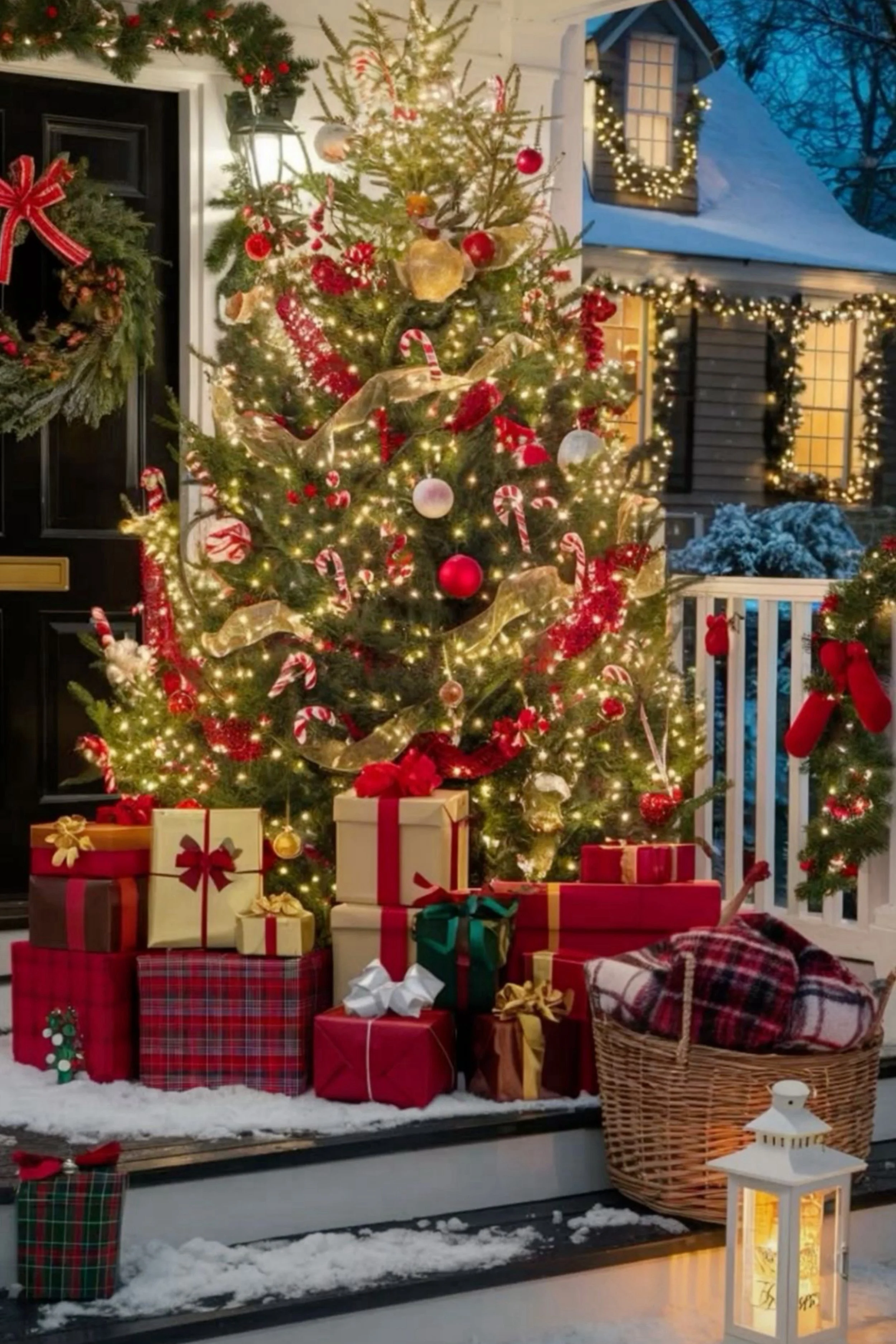 To recreate this festive welcome, start with a full-bodied outdoor Christmas tree and string it with warm white LED lights. Choose ornaments in red, gold, and candy-cane stripes to keep a cohesive palette. Arrange wrapped boxes of varying sizes beneath the tree for dimension, using different textures like plaid, velvet, and metallic paper. Incorporate a lantern or two for a flickering touch of light and a basket of throws to suggest warmth and hospitality. Frame the doorway with garland and matching wreaths for balance. Keep the lighting soft and golden—it enhances the warmth of the reds and the glint of snow for an enchanting finish.