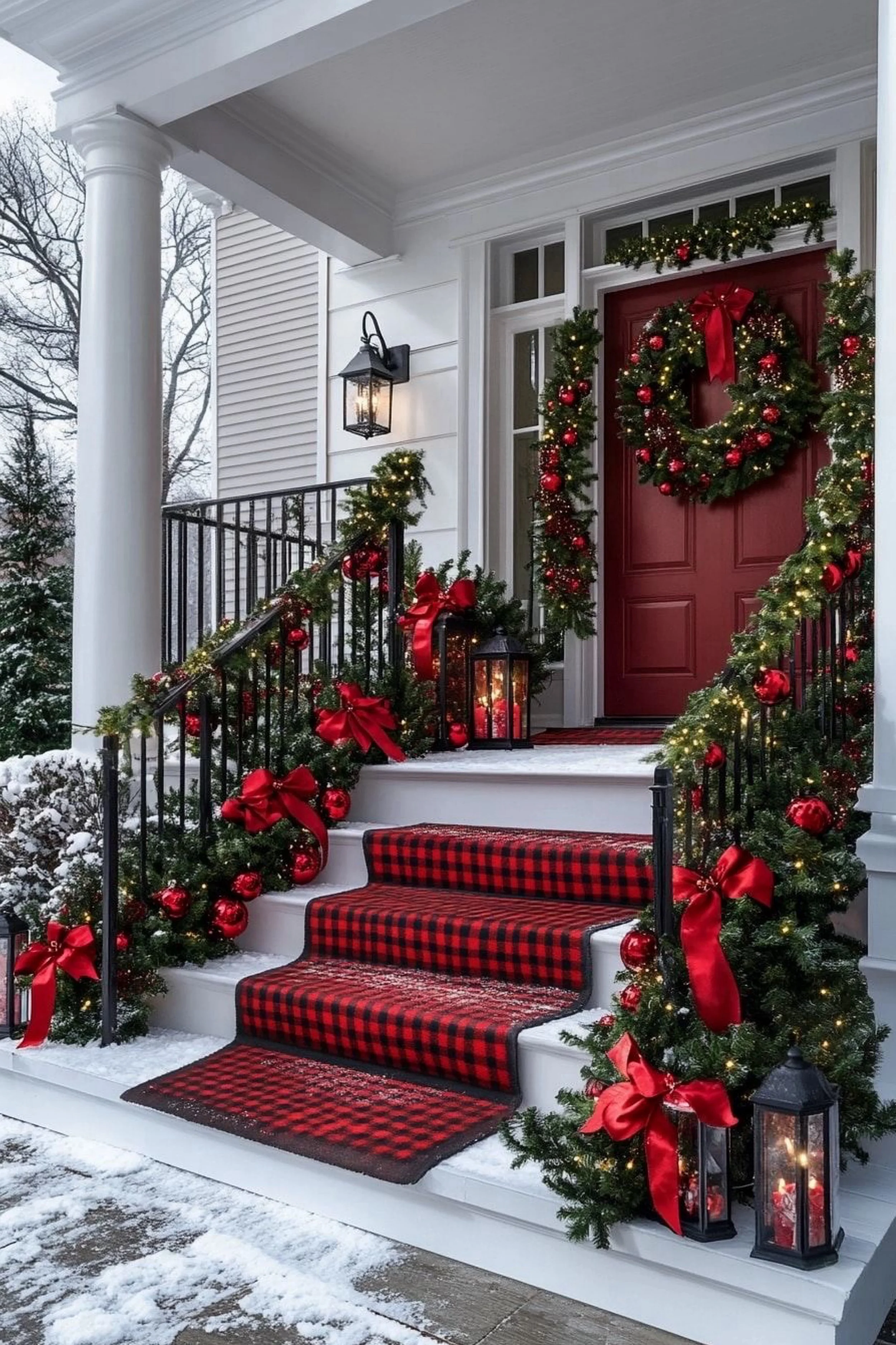 Buffalo plaid meets evergreen splendor in this captivating porch display. Red and black checkered runners guide the eye up snow-dusted steps lined with lush garlands and shining red ornaments. The greenery wraps around the railings, accented with bold bows that tie the color story together. A matching wreath crowns the doorway while lanterns flicker softly on each step, completing a tableau that feels equal parts cozy cabin and classic holiday luxury. It’s the perfect entrance for a home that celebrates both warmth and wonder.