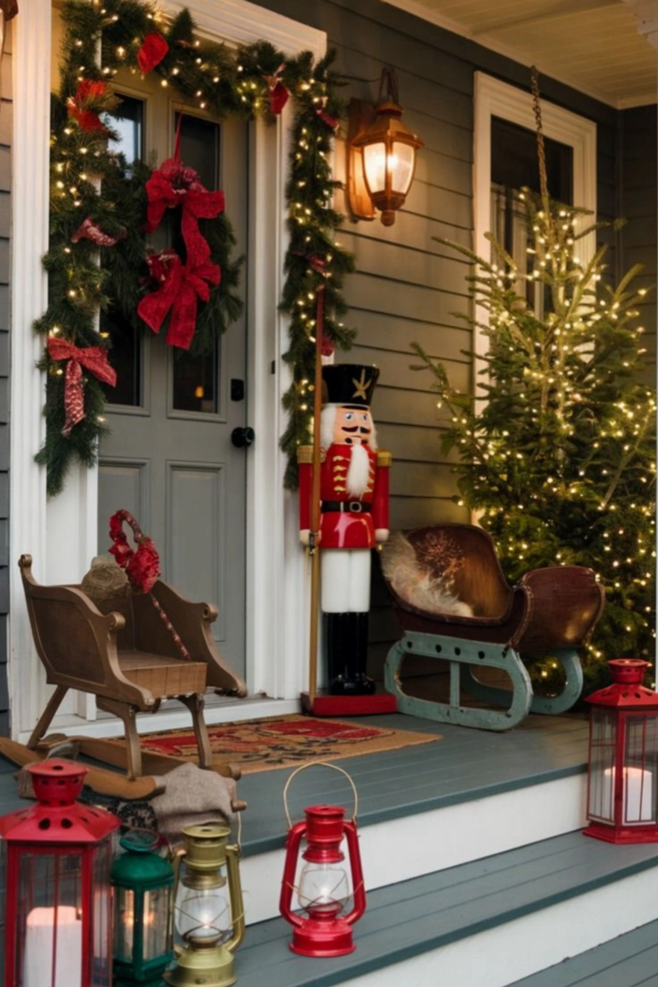 This festive porch transforms into a whimsical holiday vignette straight from a storybook. A stately nutcracker guards the door beside a rustic sleigh, while glowing lanterns line the steps in red, gold, and green. The doorway shines with lush garland trimmed in crimson ribbon, and a twinkling tree in the corner adds a final layer of warmth. The scene captures playful nostalgia—a cheerful invitation that delights both children and adults alike.