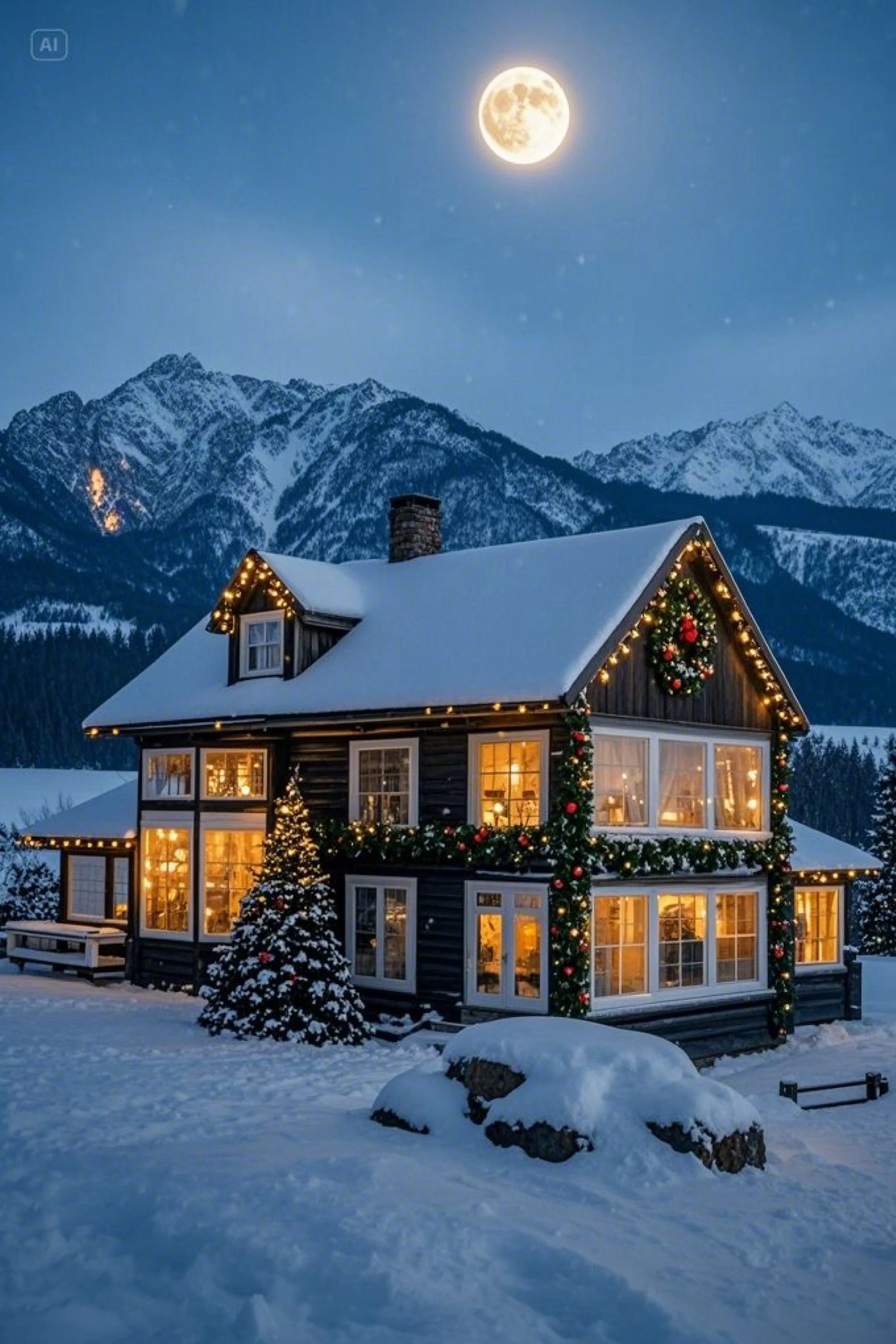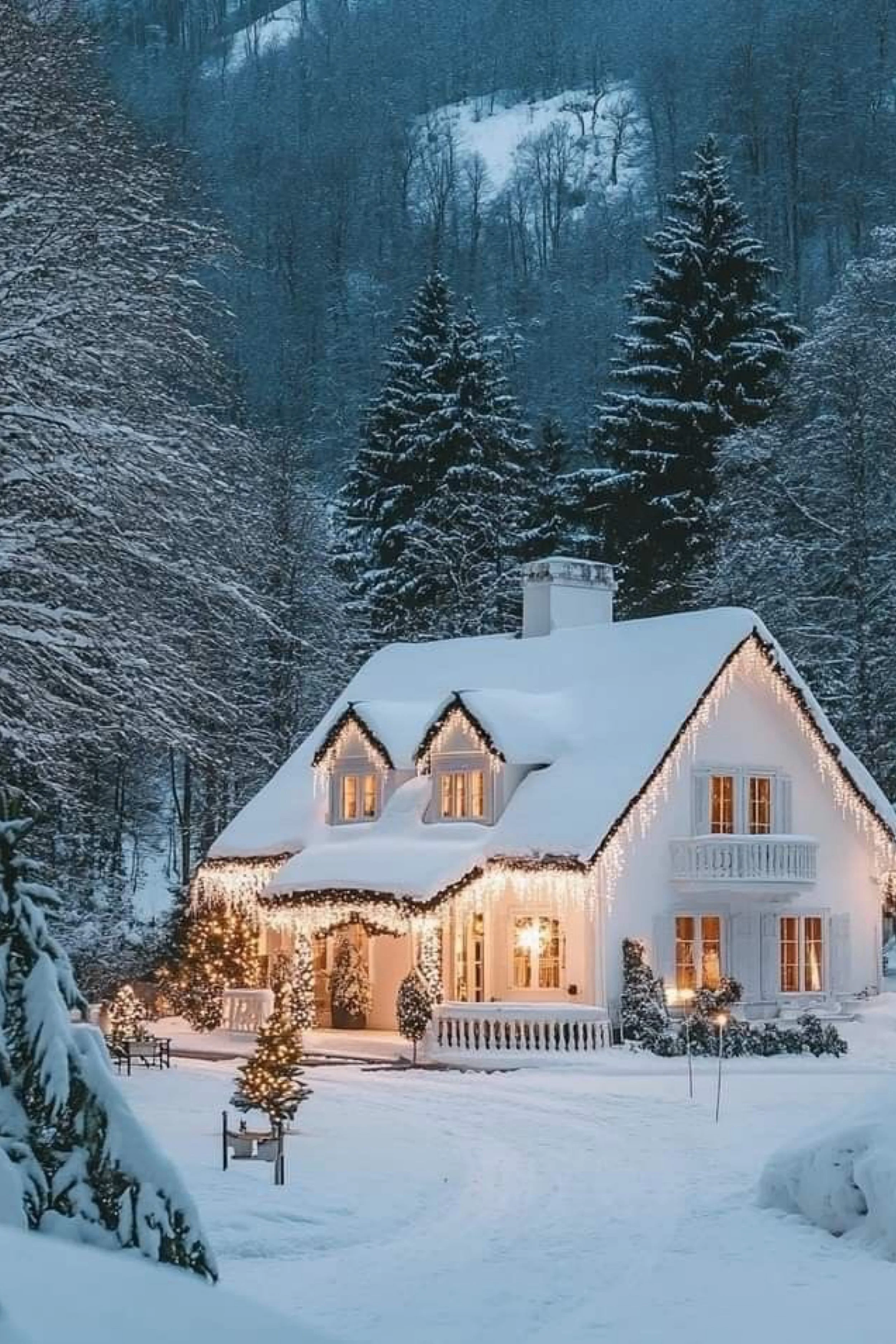 This quaint white cottage captures the gentlest side of Christmas. Its porch is lined with intricate trim, glowing warmly under icicle lights that reflect on the fresh snow. Wreaths mark every window, and garlands wind gracefully along the railings. A stately evergreen near the porch shines with soft white bulbs and a glowing star, standing like a guardian of warmth against the dark woods. Inside, light spills through lace curtains, golden and steady, giving the impression of cinnamon, pine, and laughter lingering in the air. The home feels small but magical, like a painting come to life—a perfect meeting of simplicity, nostalgia, and holiday wonder.