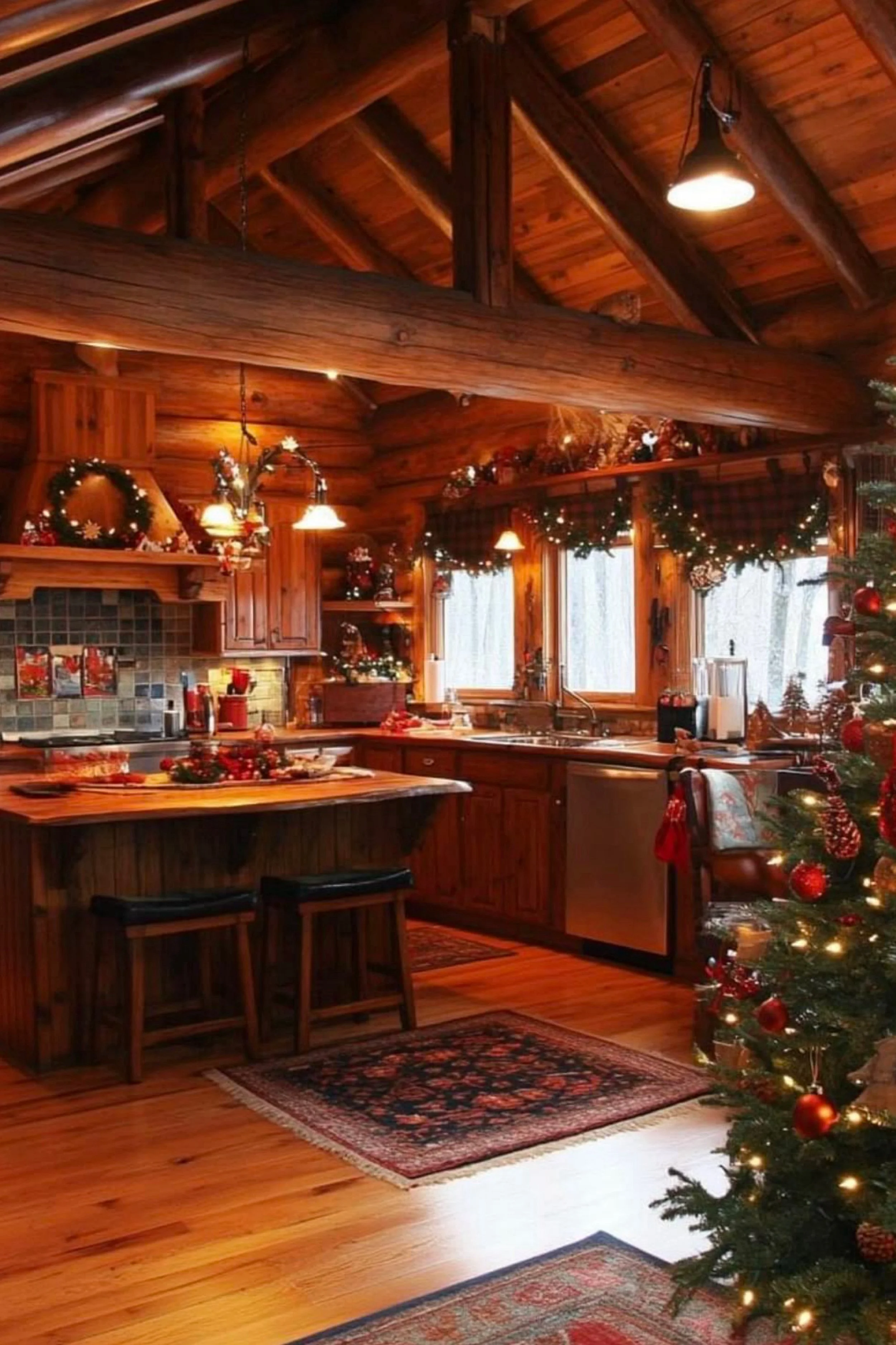 Fireside Feast: A Cabin Kitchen Dressed in Yuletide Glow