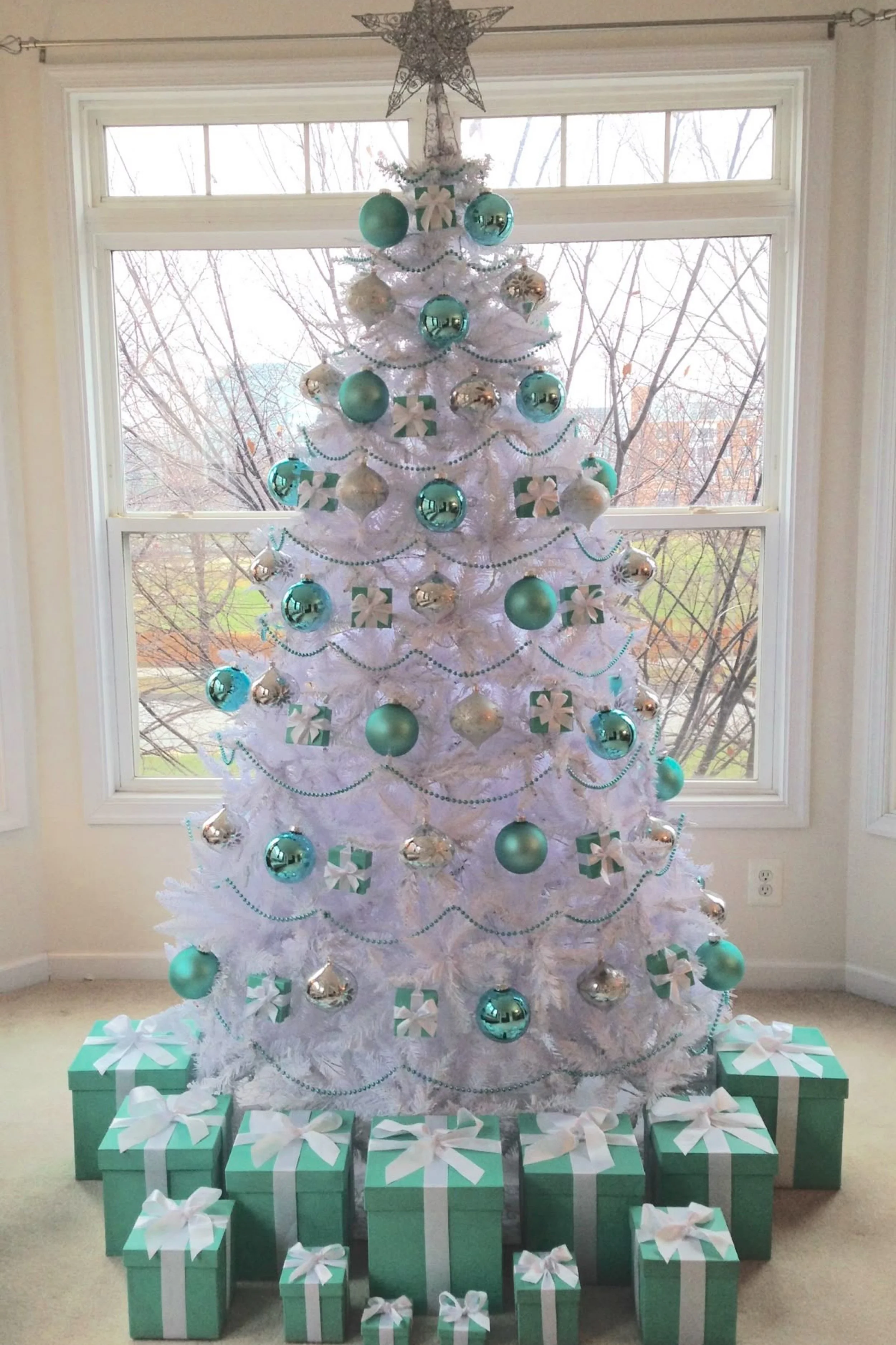 This white Christmas tree features a refreshing mint and silver palette that feels crisp, elegant, and quietly luxurious. Soft aqua ornaments mingle with pearlescent accents and delicate beaded garlands, creating a layered look that feels refined rather than busy. The neutral backdrop allows the cool tones to shine, while wrapped gifts below echo the mint color story for a polished finish. This design feels timeless and works beautifully in bright rooms with natural light.
