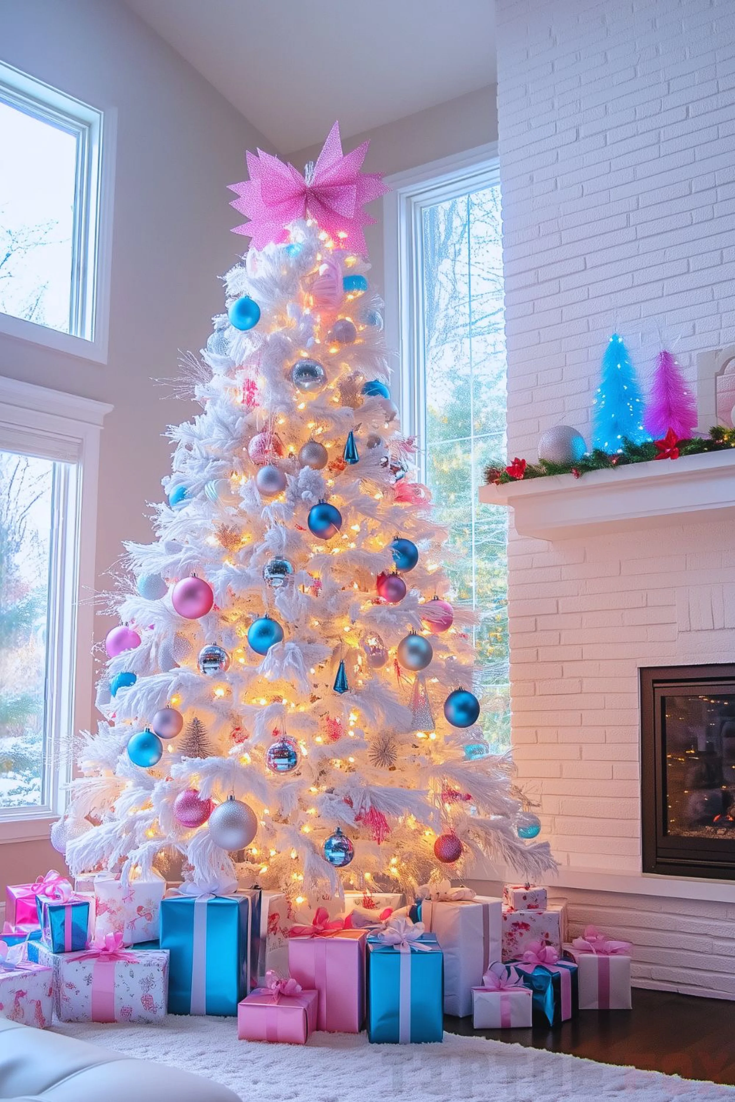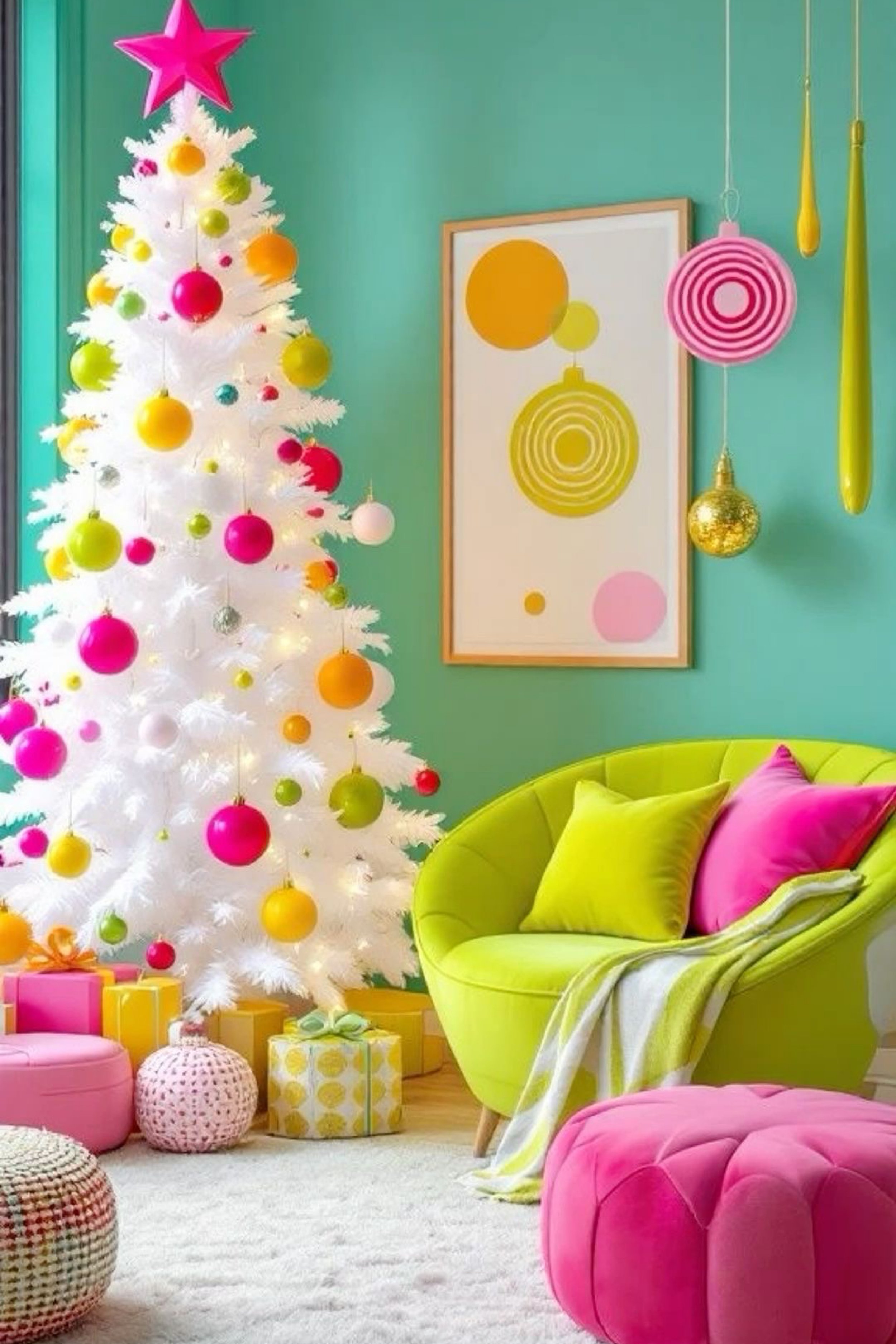 This vibrant white Christmas tree brings bold citrus tones into a playful modern setting. Hot pink, lime green, and sunny yellow ornaments energize the snowy branches, creating a fresh and youthful holiday look. The bright star topper adds a pop art finish, while surrounding décor echoes the same color palette for a cohesive room wide statement. This tree feels artistic, unconventional, and perfect for contemporary homes that favor color and creativity over tradition.