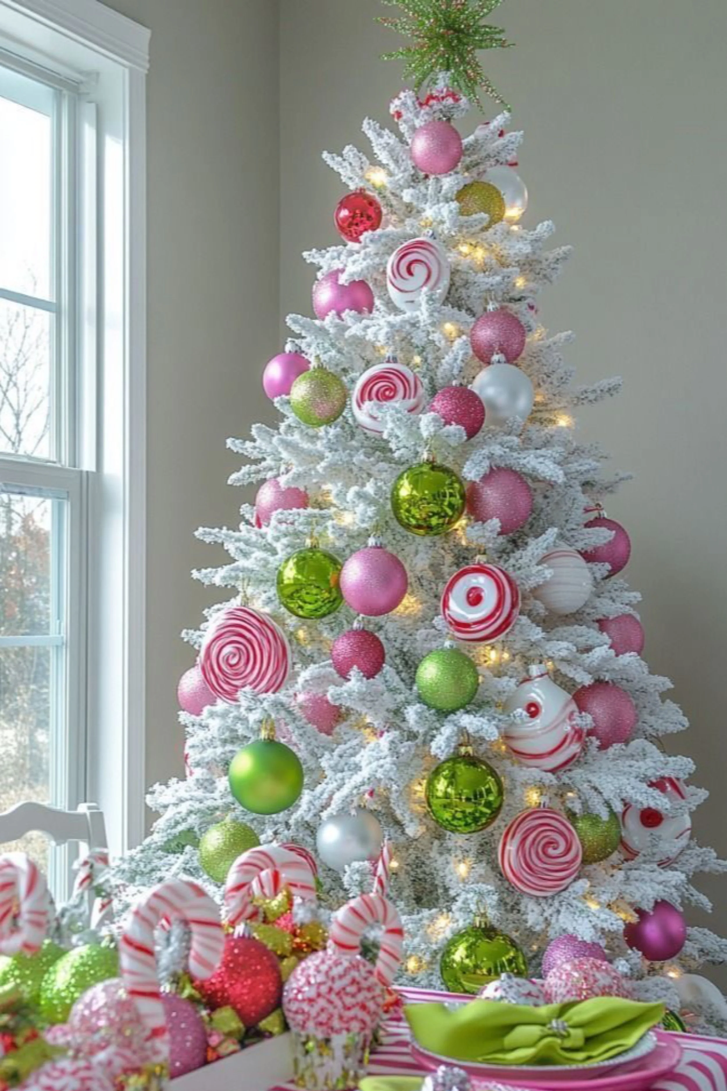 This white flocked Christmas tree feels like a confection brought to life, blending playful candy motifs with a polished pastel palette. Swirled peppermint ornaments, glossy pink balls, and vibrant lime green accents pop against snowy branches, creating a joyful and energetic visual rhythm. Warm white lights glow softly beneath the flocking, adding warmth that balances the bold ornament colors. The topper adds a whimsical finishing touch that feels festive without overpowering the tree itself. At the base, candy themed décor and coordinated tableware extend the theme beyond the tree, making the entire space feel immersive. This design is cheerful, nostalgic, and ideal for homes that embrace a spirited holiday atmosphere with a touch of sweetness.